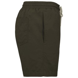Extérieur : 100% polyamide recyclé pre-consumer. Doublure intérieure en filet : 100% polyester recyclé post-consumer. Tissu ripstop. 2 poches côtés avec une surpiqûre. Double surpiqûres couture côté, entrejambe, fourche devant et dos. Ceinture élastiquée avec cordon de serrage rond en coton biologique et embouts contrastés sur toutes les couleurs. Intérieur ceinture élastiquée contrastée sur toutes les couleurs. Slip intérieur en filet avec finition biais élastiqué. Poche plaquée au dos avec surpiqûres en ouverture poche et œillet brodé. Point de renfort ceinture milieu dos pour maintenir le cordon. Ourlet simple surpiqûre bas de vêtement.