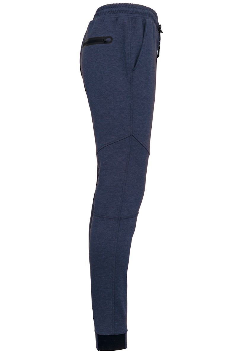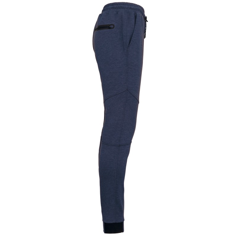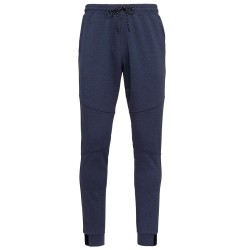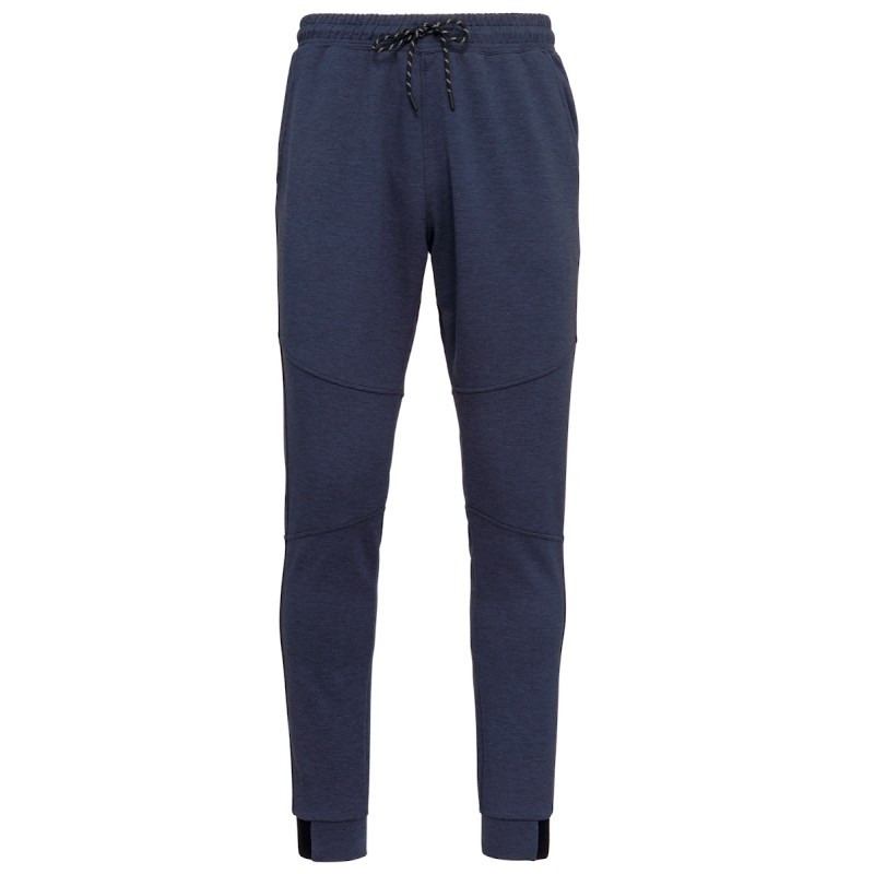 94% polyester/ 6% élasthanne (79% polyester/ 15% viscose/ 6% élasthanne pour coloris chiné). Matière ultra confortable. Ceinture élastiquée avec cordon de serrage bicolore finition embout plastique. 2 poches devant doublure jersey 65% polyester/ 35% viscose et 1 poche arrière zippée finition thermosoudée. Coupe moderne et ajustée avec empiècements genoux. Bas de jambes resserré avec une partie élastiquée contrastée Black sur tous les coloris et Dark Grey sur le Ash Heather.