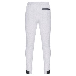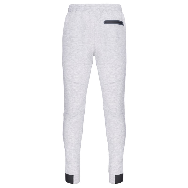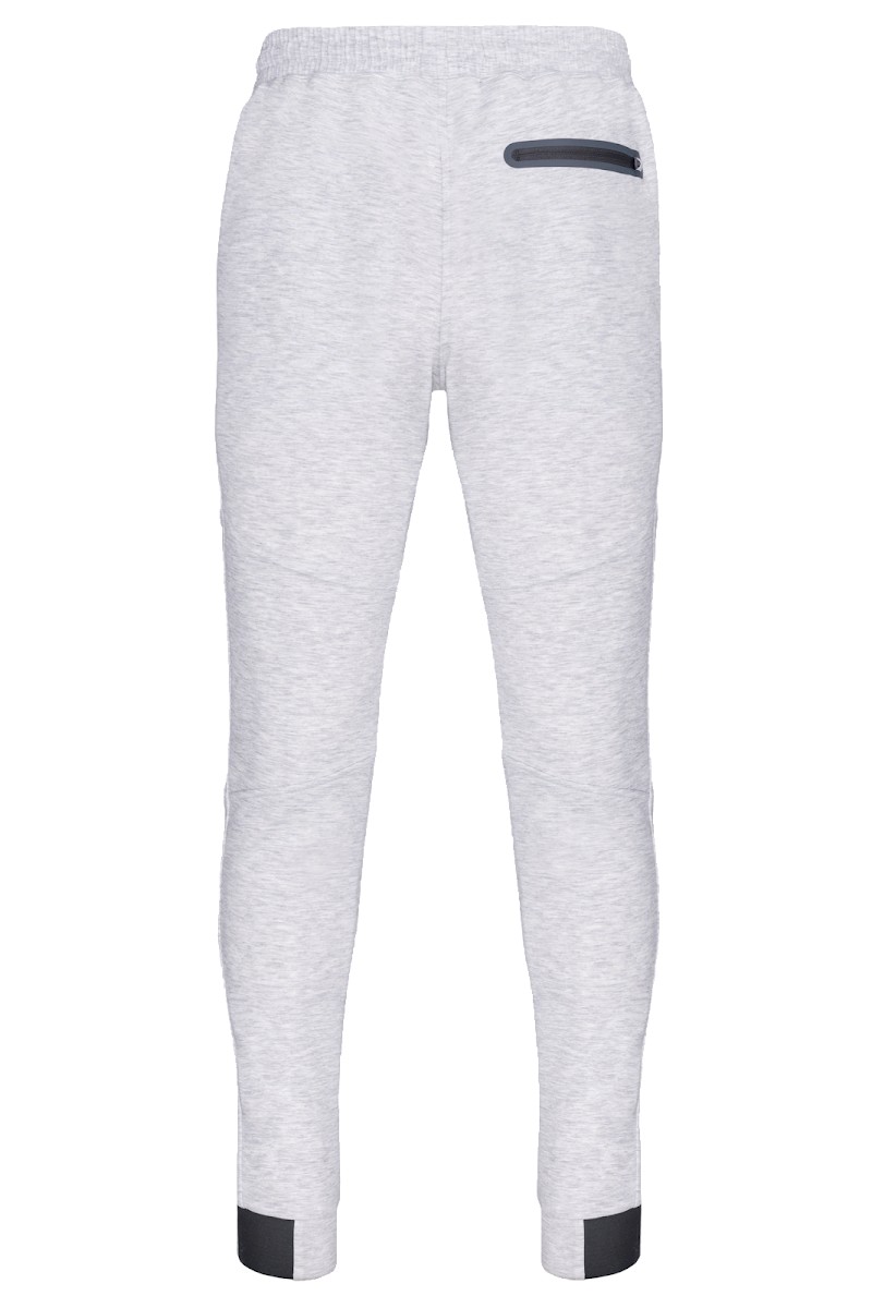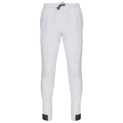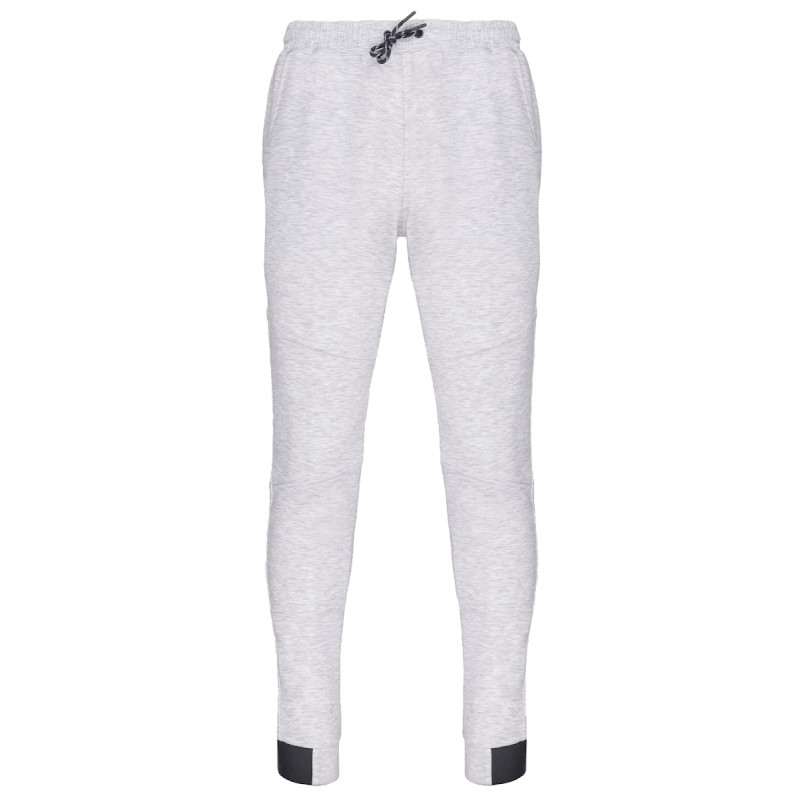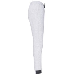 94% polyester/ 6% élasthanne (79% polyester/ 15% viscose/ 6% élasthanne pour coloris chiné). Matière ultra confortable. Ceinture élastiquée avec cordon de serrage bicolore finition embout plastique. 2 poches devant doublure jersey 65% polyester/ 35% viscose et 1 poche arrière zippée finition thermosoudée. Coupe moderne et ajustée avec empiècements genoux. Bas de jambes resserré avec une partie élastiquée contrastée Black sur tous les coloris et Dark Grey sur le Ash Heather.
