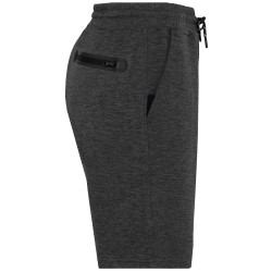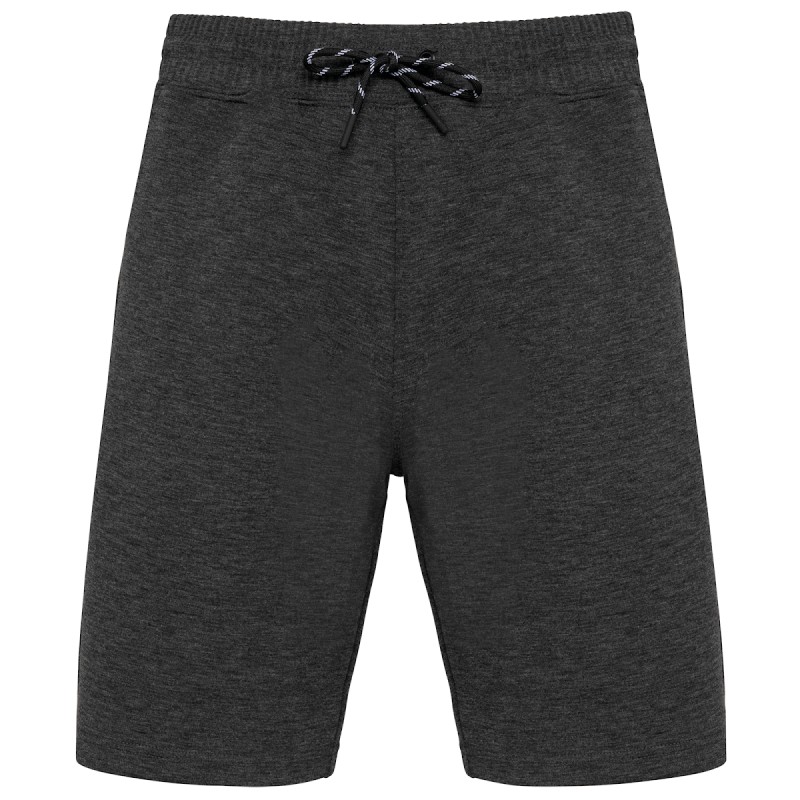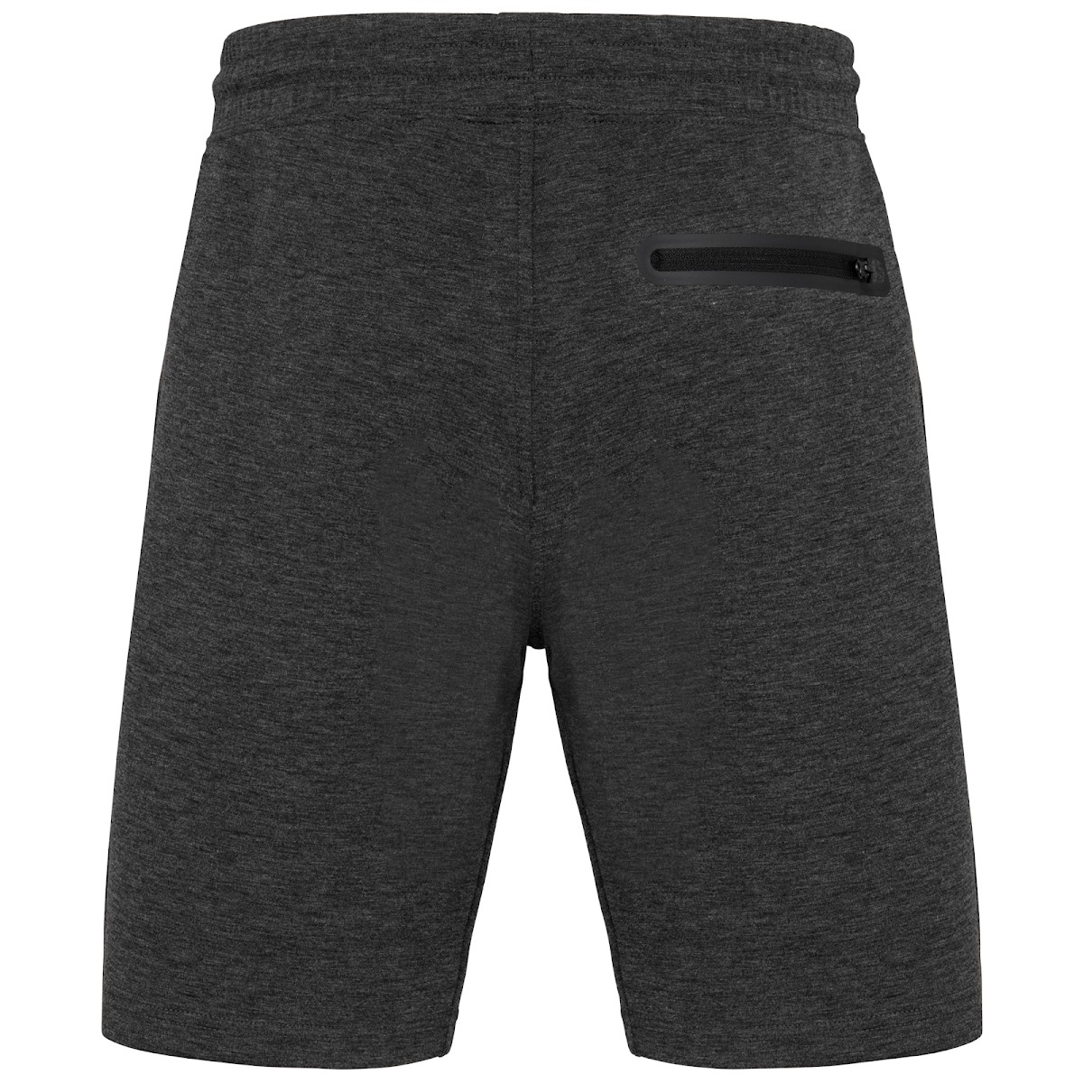 Coloris unis: 94% polyester/ 6% élasthanne. Coloris chinés : 79% polyester/ 15% viscose/ 6% élasthanne. Matière ultra confortable. Ceinture élastiquée avec cordon de serrage bicolore finition embout plastique et œillets métalliques. 2 poches devant doublées jersey et 1 poche arrière zippée, finition thermosoudée contrastée. Finition poches avec une partie élastiquée contrastée Black sur tous les coloris et Dark Grey sur le Black et le Ash Heather. Finition double aiguille sur bas de vêtement. Etiquette de marque Tear-away.