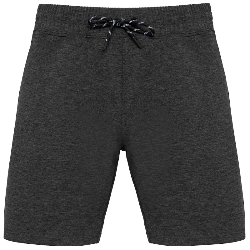 Coloris unis: 94% polyester/ 6% élasthanne. Coloris chinés : 79% polyester/ 15% viscose/ 6% élasthanne. Matière ultra confortable. Ceinture élastiquée avec cordon de serrage bicolore finition embout plastique et œillets métalliques. 2 poches devant doublées jersey et 1 poche arrière zippée, finition thermosoudée contrastée. Finition poches avec une partie élastiquée contrastée Black sur tous les coloris et Dark Grey sur le Black et Ash Heather. Finition double aiguille sur bas de vêtement. Etiquette de marque Tear-away.