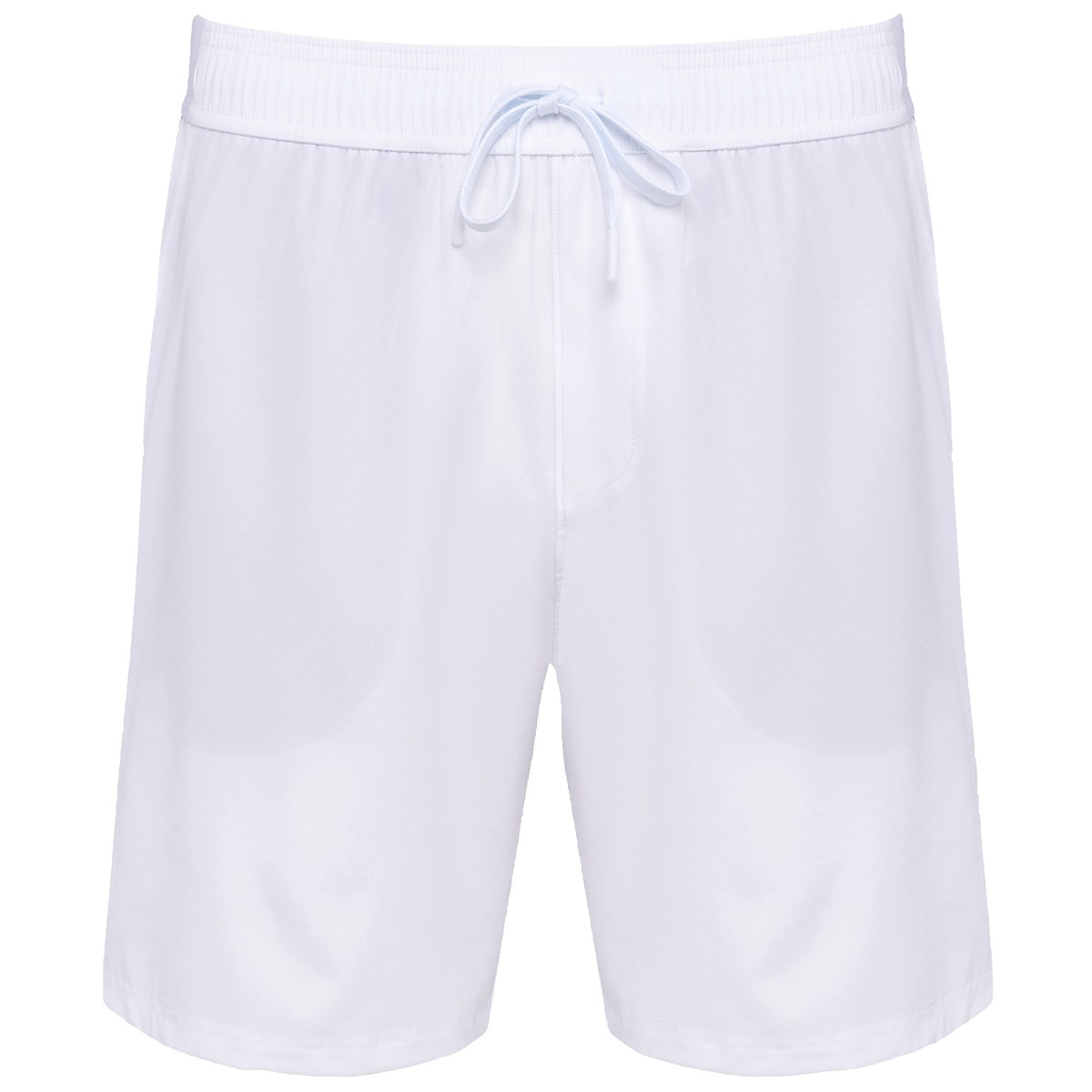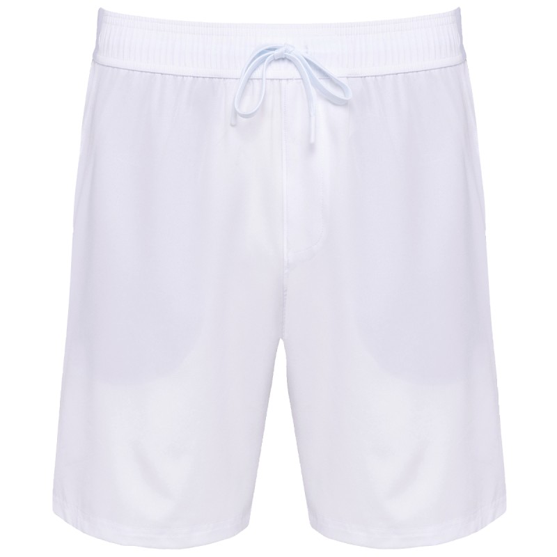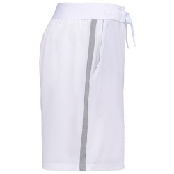 92% polyester/ 8% élasthanne. Matière ultra confortable. 2 poches devant. 2 bandes maille filet contrastées et appliquées sur les côtés. Ceinture élastiquée en 2 parties avec cordon de serrage plat et finition embout plastique. Finition double aiguille sur bas de vêtement. Etiquette de marque Tear-away.