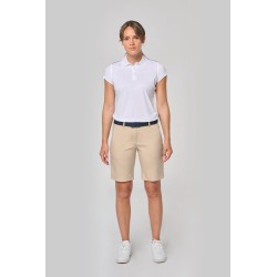 96% polyester / 4% élasthanne. Matière souple et déperlante pour un confort optimal. Coupe élégante et ajustée. Ceinture avec passants, 2 poches profondes côtés et 2 poches arrière passepoilées avec rabat.