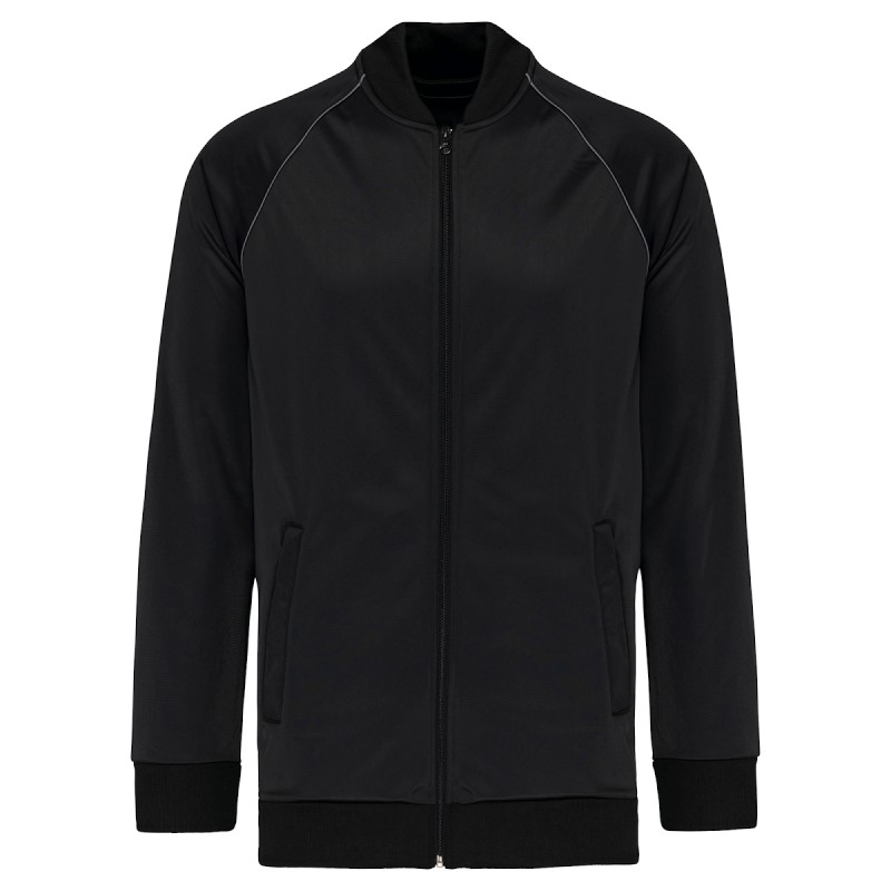 100% polyester tricot. Coupe droite. Fermeture zippée nylon ton sur ton. Manches raglan avec liseré contrasté. Bord-côte 1x1 au col, bas de manches et de vêtement. 2 poches latérales zippées. Etiquette de marque détachable pour faciliter la personnalisation.
