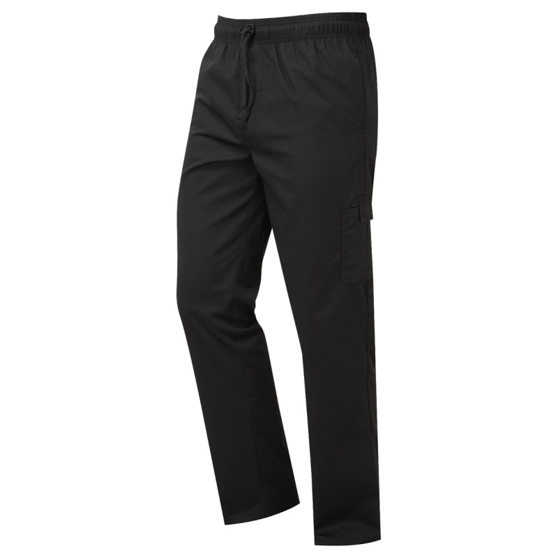 Pantalon de cuisinier avec poches cargo classiques sur chaque jambe, qui se ferment par une bande auto-agrippante. Ceinture élastique pour plus de confort, qui s'ajuste par un cordon. Poche plaquée arrière à fermeture bande auto-agrippante.