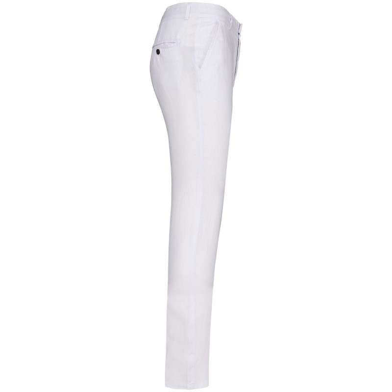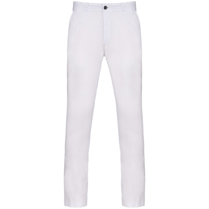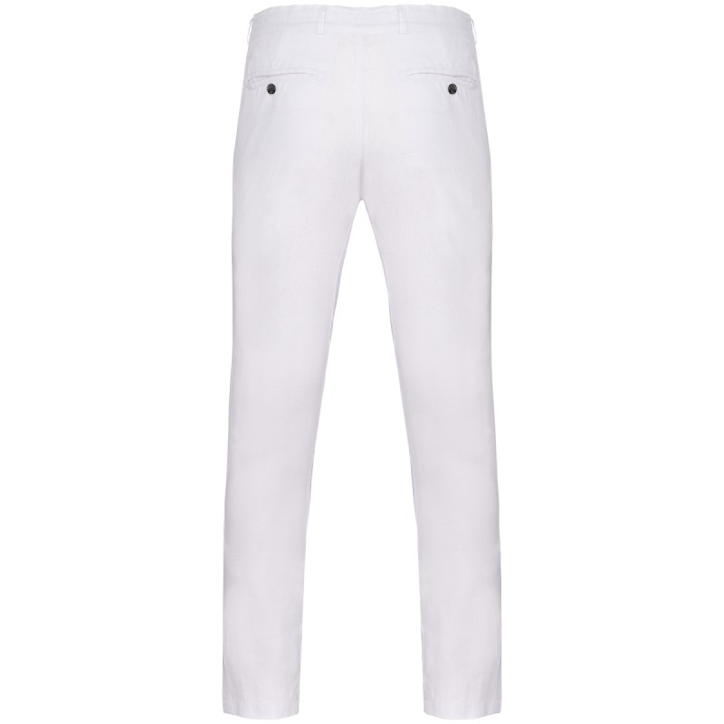 100% lin. Tissé. Ceinture avec passants et finition intérieure ceinture avec une anglaise contrastée de couleur bleu marine. Braguette avec bouton en plastique recyclé effet marbré et zip en métal recyclé. Deux poches devant avec surpiqûre. Deux poches passepoilées au dos avec bouton en plastique recyclé effet marbré. Fonds de poches dos et devant en chevrons ton sur ton. Piqûre nervure fourche devant et dos pour plus de renfort. Finition bas de jambes avec ourlet simple surpiqûre. Vêtement lavé après montage : les couleurs peuvent varier d'un produit à l'autre.