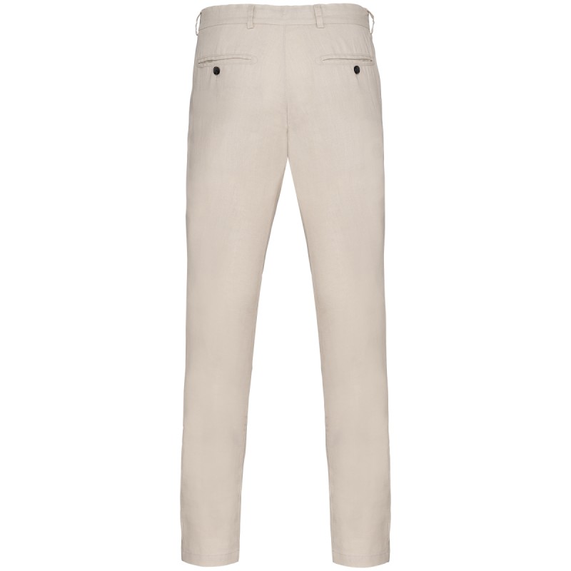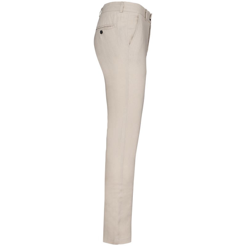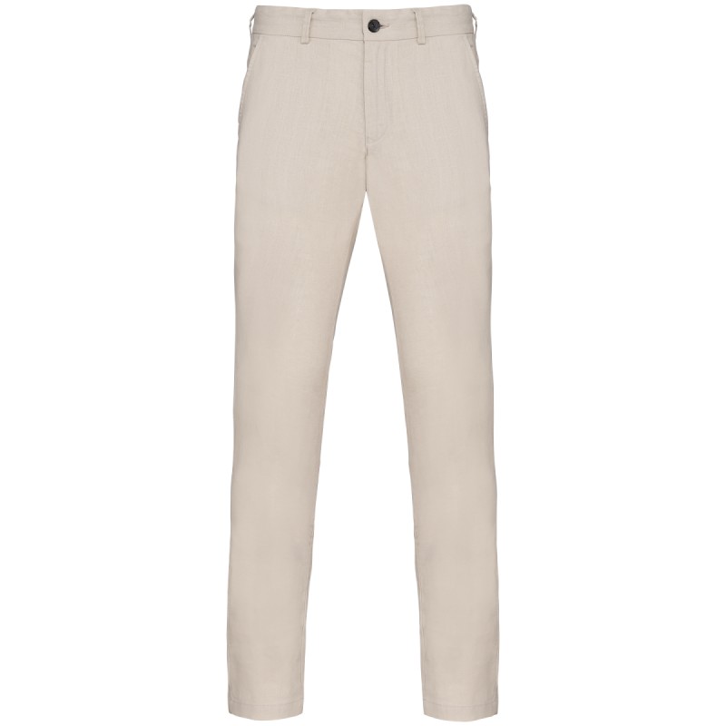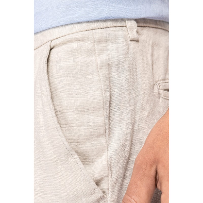 100% lin. Tissé. Ceinture avec passants et finition intérieure ceinture avec une anglaise contrastée de couleur bleu marine. Braguette avec bouton en plastique recyclé effet marbré et zip en métal recyclé. Deux poches devant avec surpiqûre. Deux poches passepoilées au dos avec bouton en plastique recyclé effet marbré. Fonds de poches dos et devant en chevrons ton sur ton. Piqûre nervure fourche devant et dos pour plus de renfort. Finition bas de jambes avec ourlet simple surpiqûre. Vêtement lavé après montage : les couleurs peuvent varier d'un produit à l'autre.