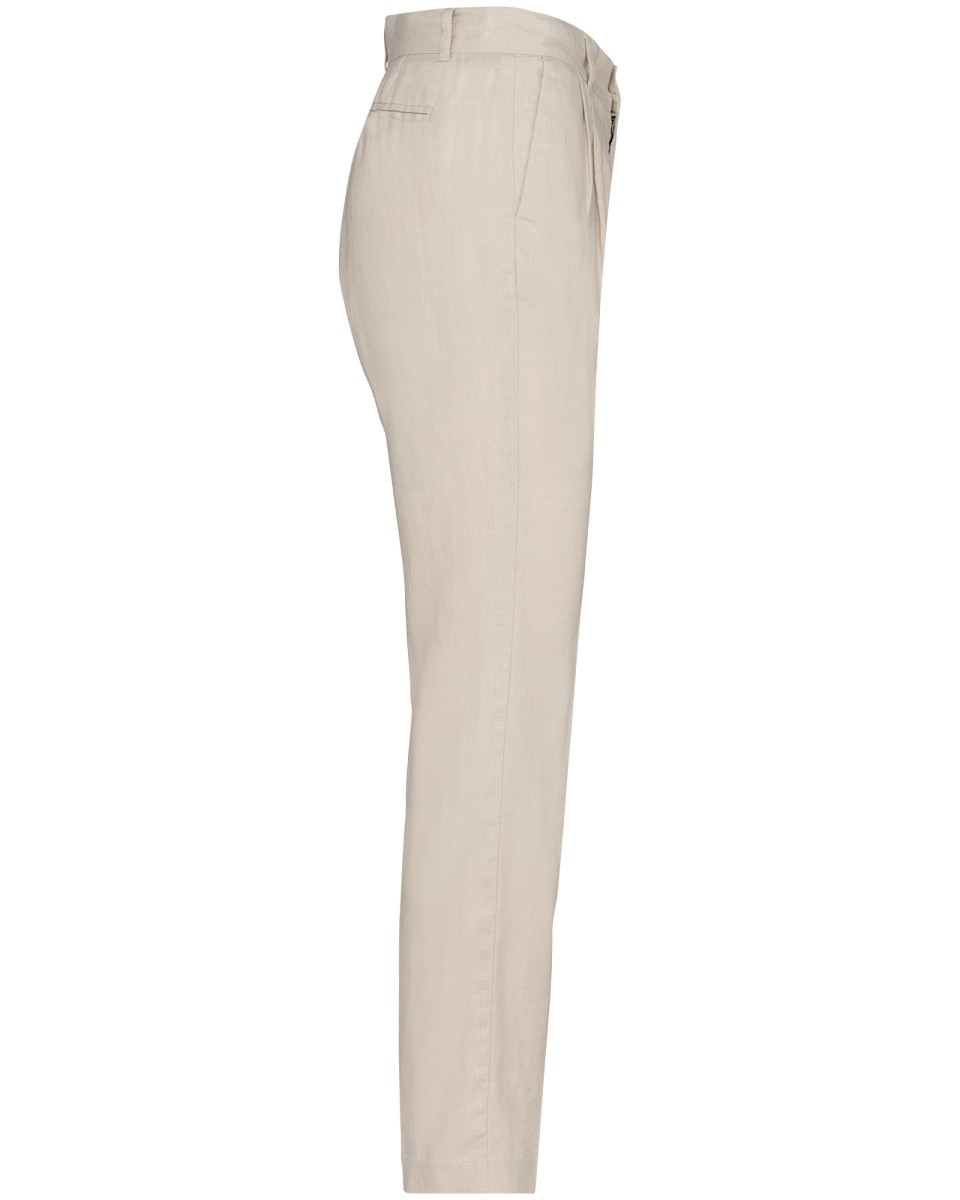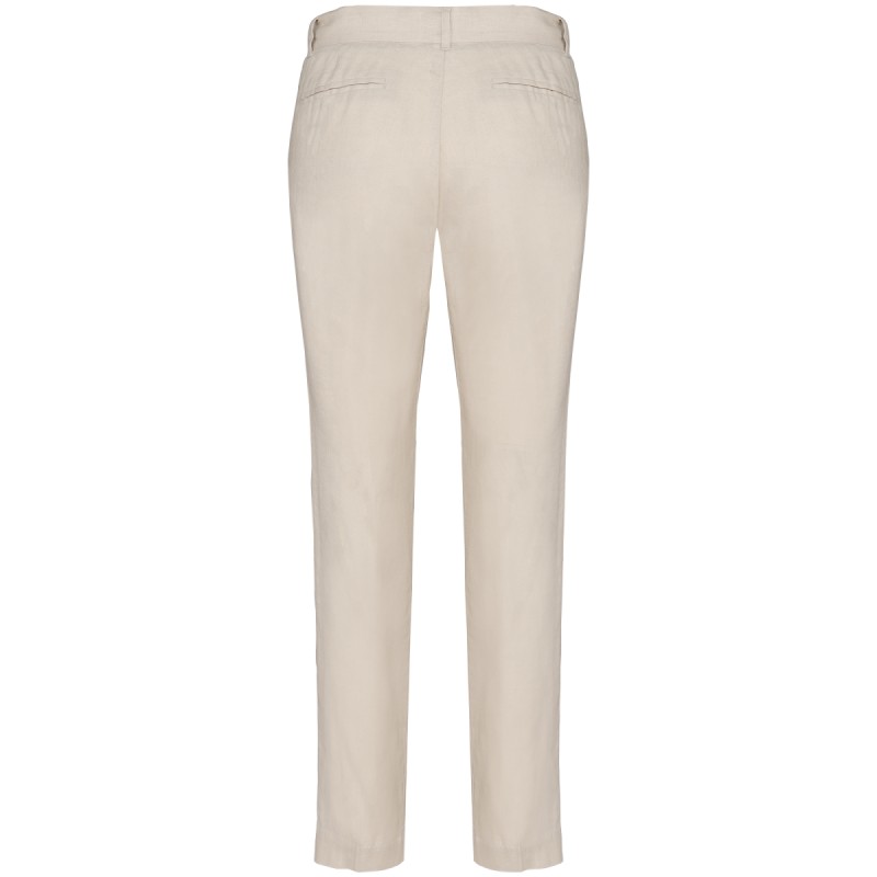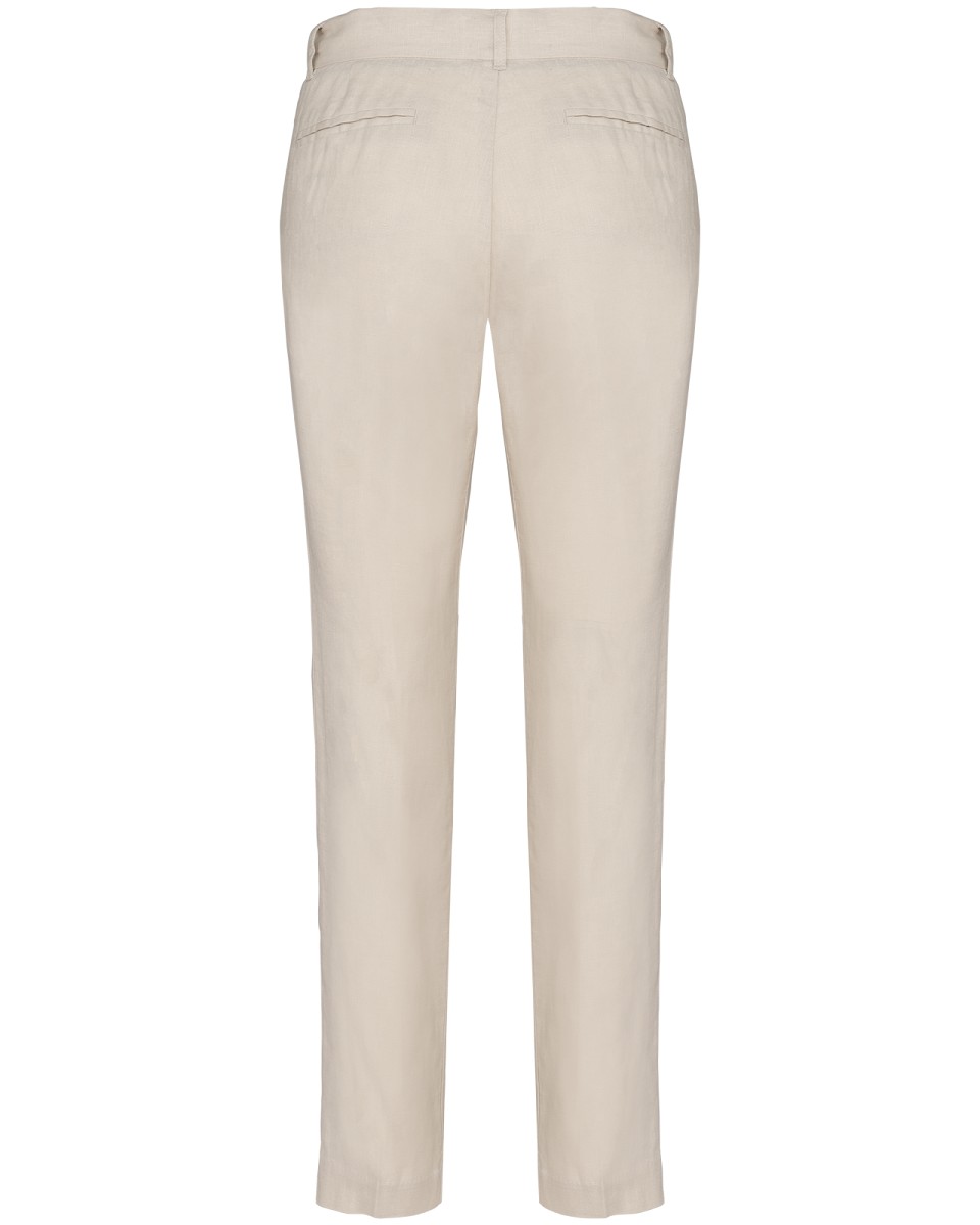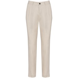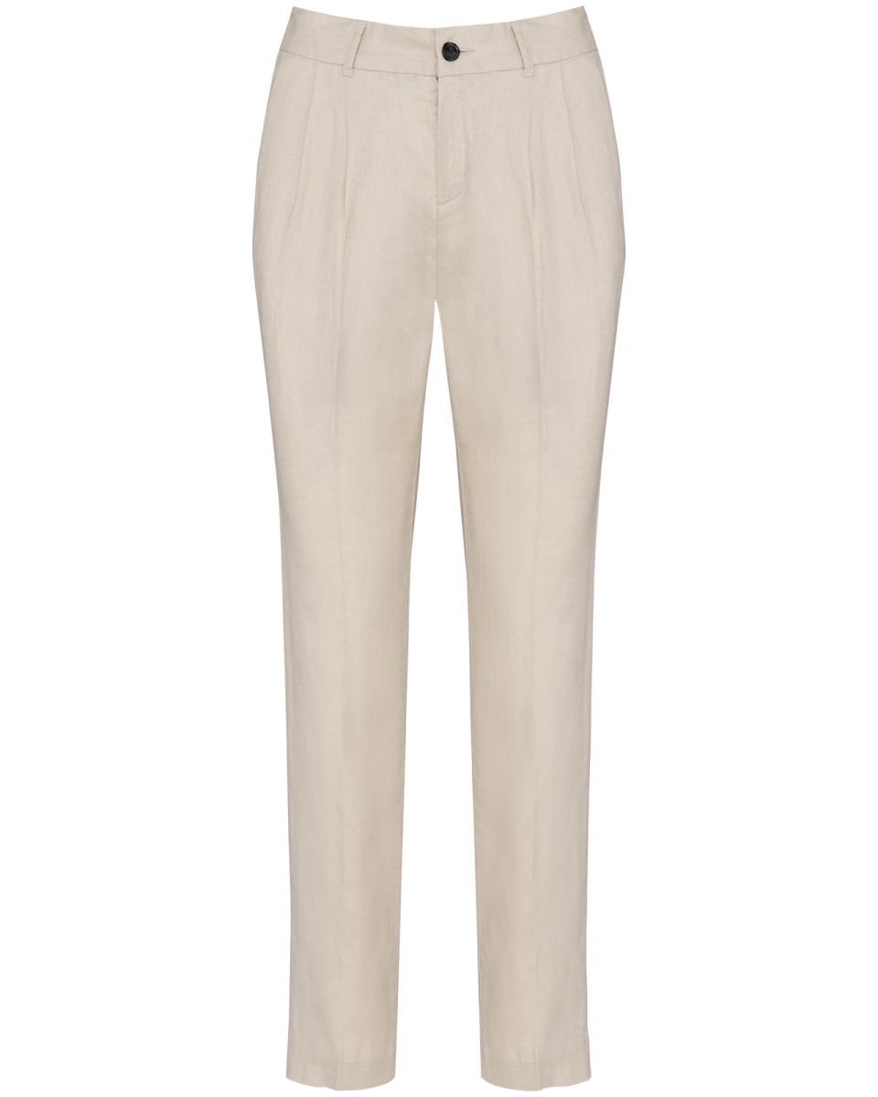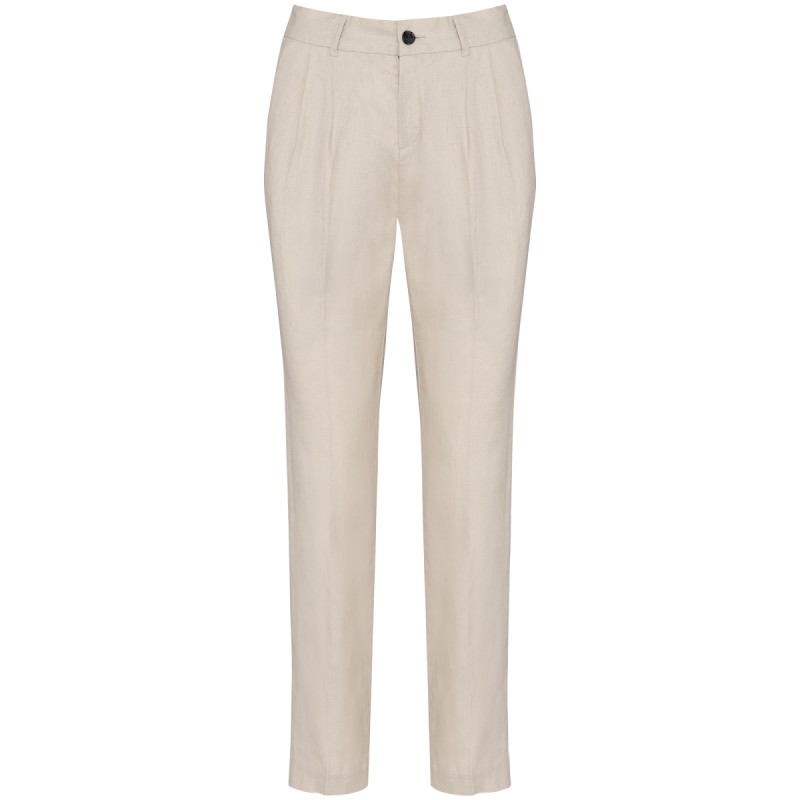 100% lin. Tissé. Ceinture avec passants. Finition intérieure ceinture avec un biais de propreté contrasté de couleur bleu marine sur la couleur Linen Sand et ton sur ton sur la couleur White. Braguette avec bouton en plastique recyclé effet marbré et zip en métal recyclé. Deux plis d’aisance devant, avec un pli permanent jambe devant et dos. Deux poches devant et deux fausses poches passepoilées au dos. Fonds de poches devant en chevrons ton sur ton. Piqûre nervure fourche devant et dos pour plus de renfort. Finition bas de jambes avec ourlet invisible. Vêtement lavé après montage : les couleurs peuvent varier d'un produit à l'autre.