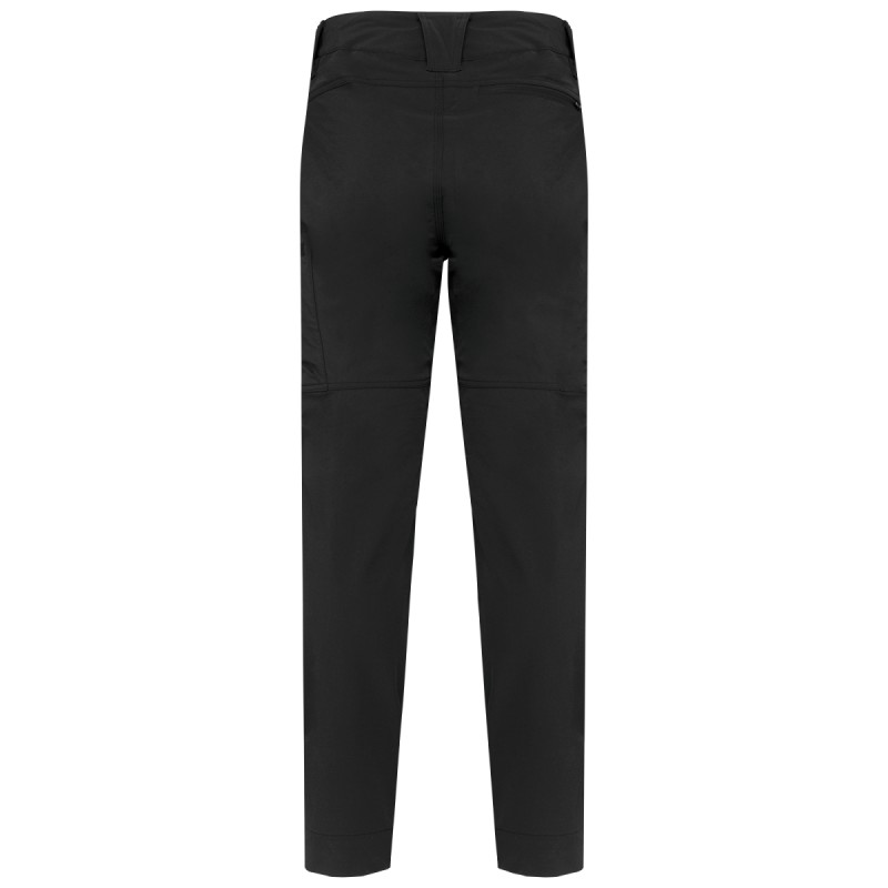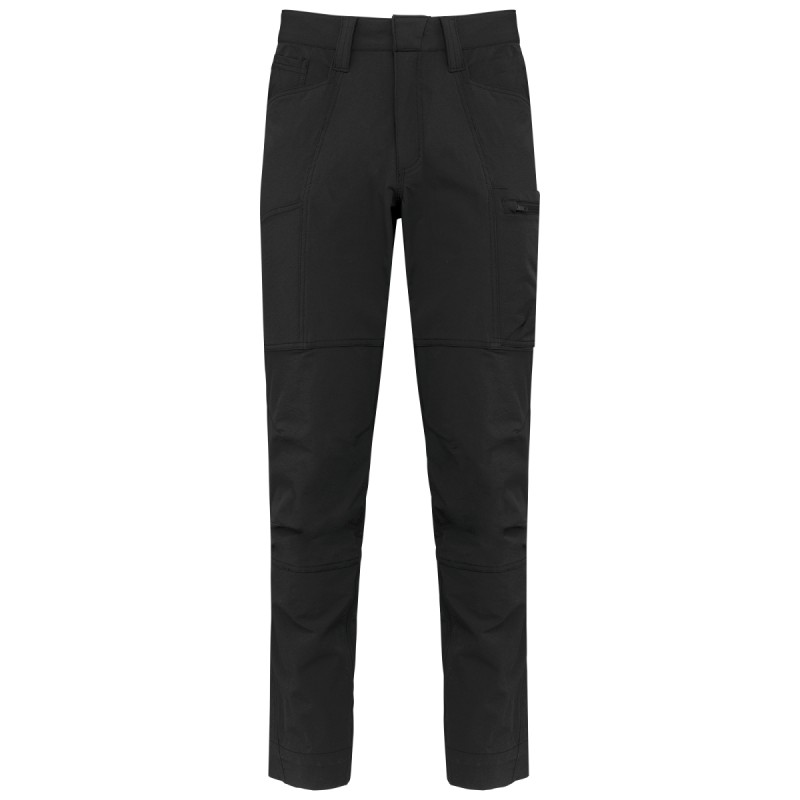 70% polyamide recyclé / 22% coton / 8% élasthanne. Tissu dobby stretch. Lavage 40°C. 2 poches devant. 1 poche ticket sur le côté droit au porté. 1 poche plaquée zippée côté gauche au porté. 1 poche plaquée devant + 1 poche zippée dos côté droit au porté. Découpes devant et dos. Ceinture avec passants dont 1 large et renforcé milieu dos. Taille ajustable à l’intérieur dos à l’aide d’un élastique. Fermeture zippée et bouton plastique dissimulé par tissu principal. Empiècements genoux ton sur ton. Triple coutures entrejambe, côtés, et fourche, devant et dos. Ourlet ajustable de 5 cm. Etiquette de marque détachable.