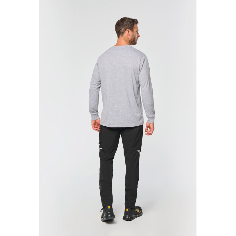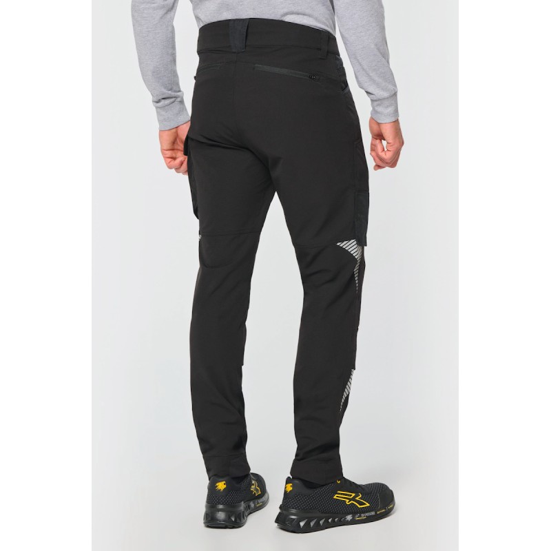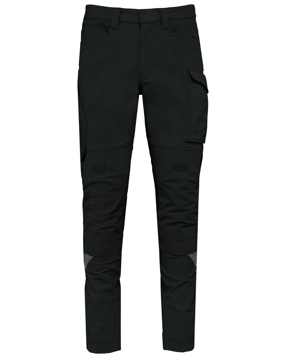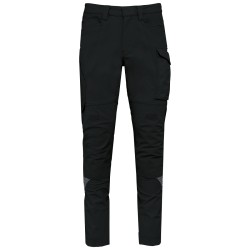 63% polyamide recyclé / 30% coton / 7% élasthanne. Tissu dobby stretch. Lavage 40°C. 2 poches devant. 1 poche ticket sur le côté droit au porté. 1 poche cargo à soufflet fermée par bande auto agrippante + 1 poche plaquée en tissu renforcé sur le côté gauche au porté. 1 poche mètre charpentier volante + 1 poche plaquée compartimentée en tissu renforcé comportant 2 porte-outils sur le côté droit au porté. 2 poches genouillères en Cordura® stretch 92% polyamide, 8% élasthanne ton sur ton (genouillères non fournies) avec bande auto agrippante et rabat intérieur pour maintenir et adapter la genouillère. 2 poches zippées dos. Bas de jambe intérieure renforcé en Cordura® stretch ton sur ton. Details rétro réfléchissants sur le devant et l'arrière de la jambe. Ceinture avec passants dont 1 large et renforcé milieu dos. Taille ajustable à l’intérieur dos à l’aide d’un élastique. Fermeture zippée et bouton plastique dissimulé par tissu renforcé. Triple coutures entrejambe, côtés, et fourche, devant et dos. Ourlet ajustable de 5 cm. Certifications en cours : EPI Classe II. Normes NF EN ISO 13688:2013 + NF EN ISO 13688/A1:2021 (Vêtements de protection - Exigences générales), NF EN 14404-1:2024 + NF EN 14404-3:2024 : Niveau 1U uniquement en combinaison avec les genouillères de protection WKP150 (Équipements de protection individuelle - Protecteurs de genoux pour le travail à genoux). Etiquette de marque détachable.