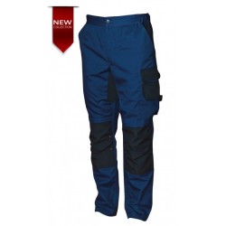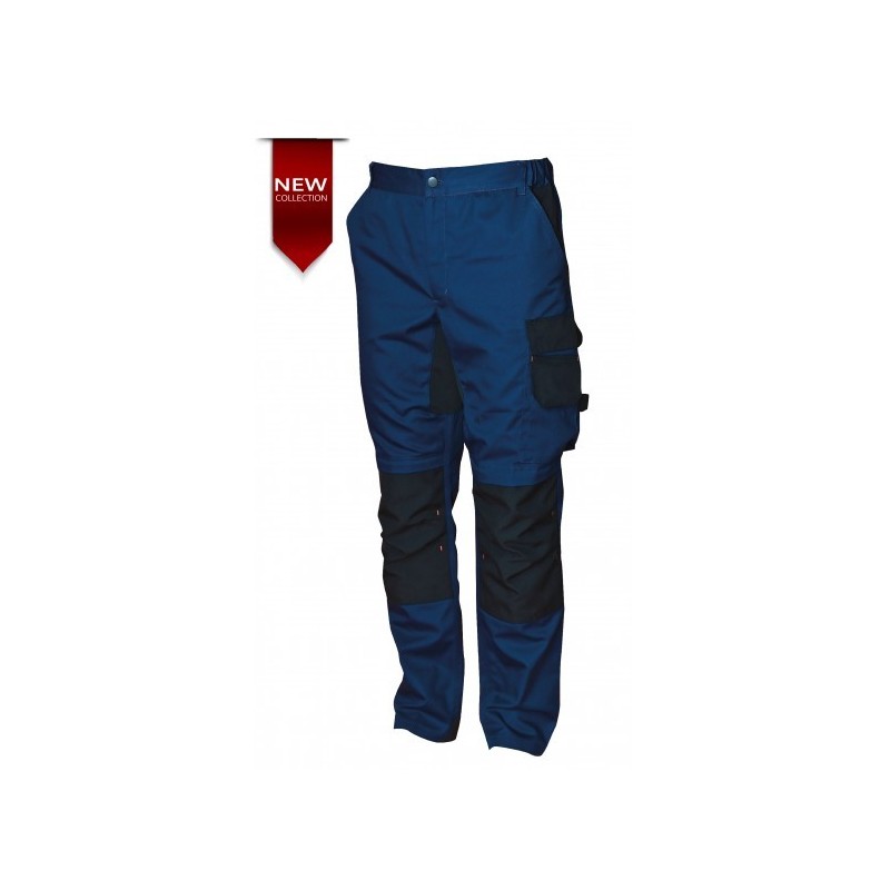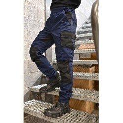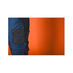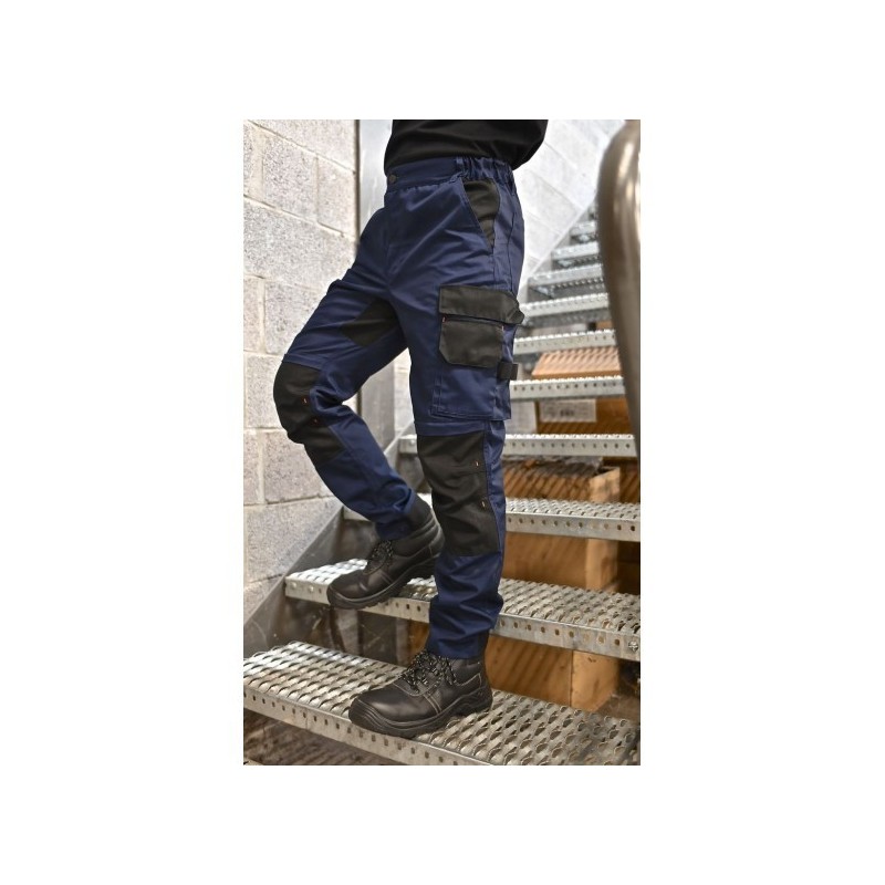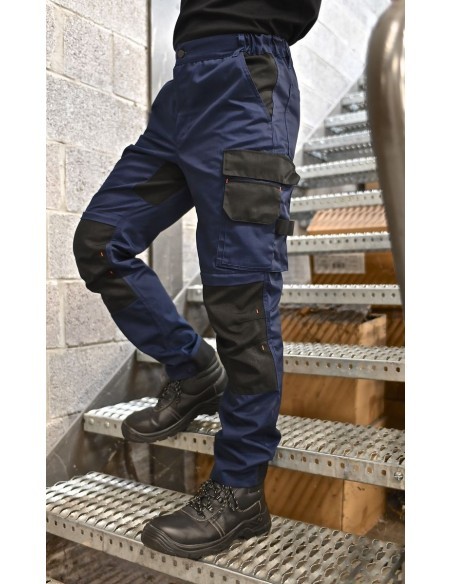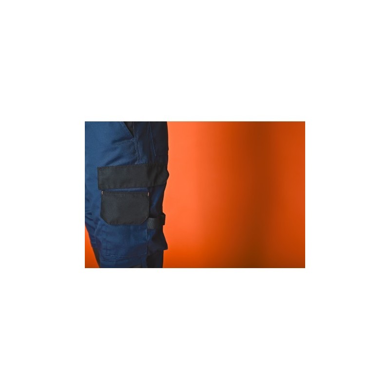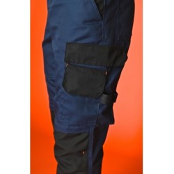 Ceinture élastique aux côtés, bouton clou et braguette glissière, poches italiennes, 1 poche combat côté gauche, 1 poche téléphone et une sangle, poches genouillère en tissu type Cordura, 2 poches plaquées dos, 1 poche mètre avec compartiments stylo