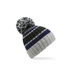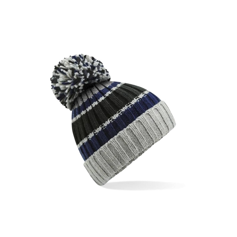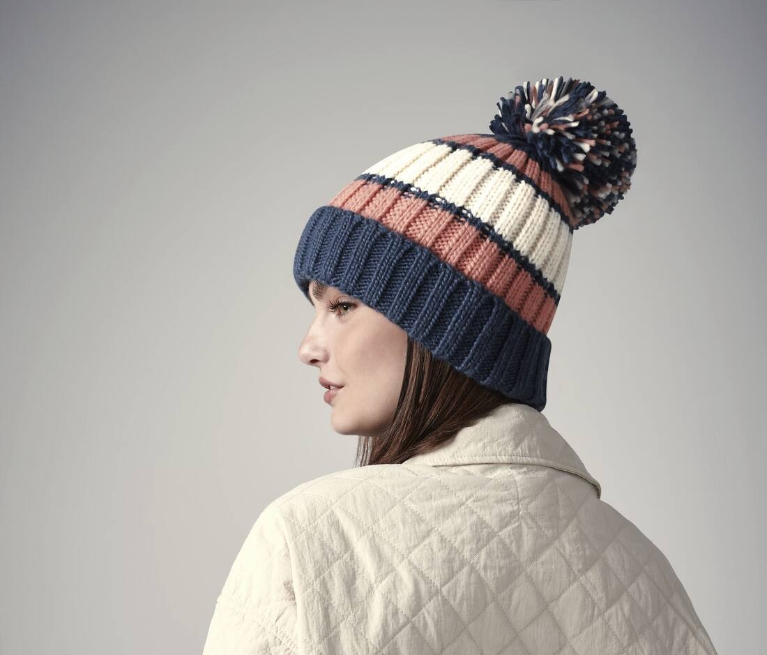 Maille côtelée épaisse. Rayures tricolores vives. Grand pompon luxueux.