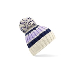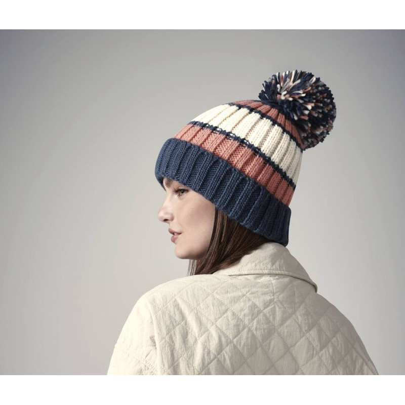 Maille côtelée épaisse. Rayures tricolores vives. Grand pompon luxueux.