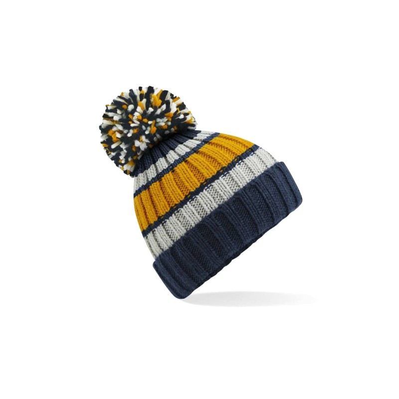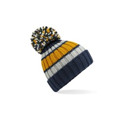 Maille côtelée épaisse. Rayures tricolores vives. Grand pompon luxueux.