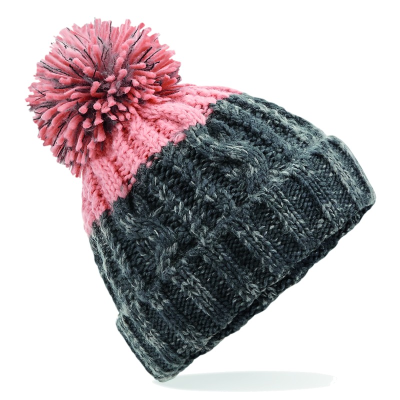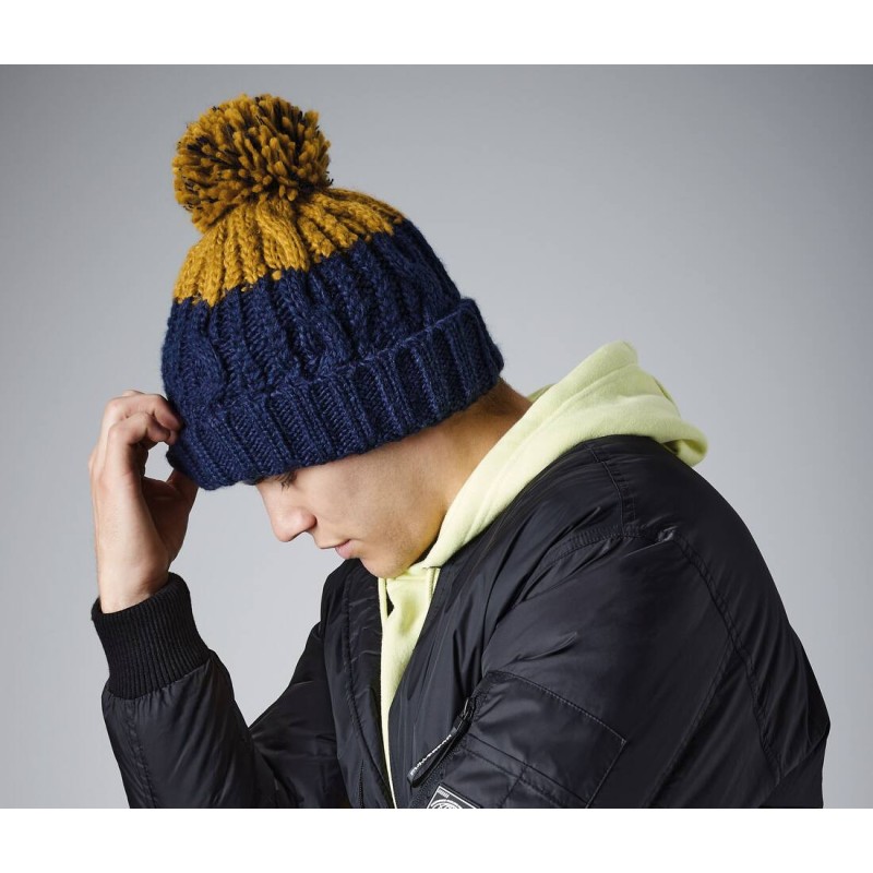 100% Soft-Touch Acrylique | Étiquette détachable pour faciliter la modification de la marque | Maille torsadée épaisse à multiples fils | Modèle bicolore | Pompon de luxe | Bande thermique luxueuse en mouton pour plus de chaleur | Conception à revers pour une décoration optimale