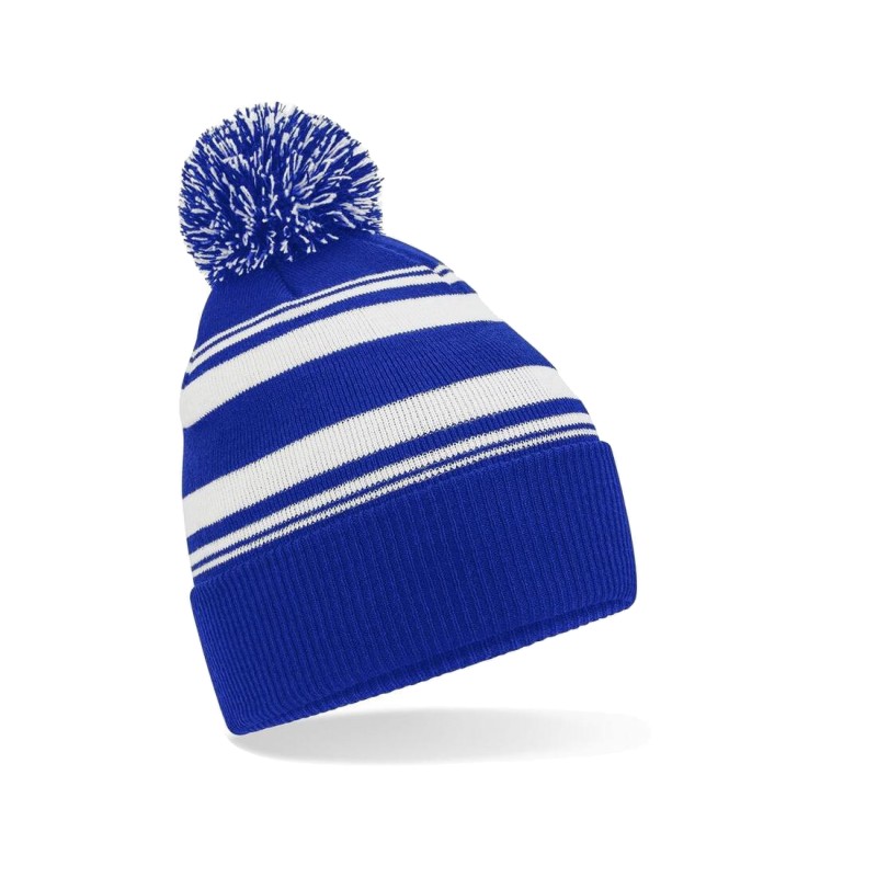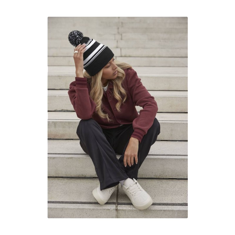 Contient 50% de polyester recyclé. Doublé. Pompon bicolore. Avec revers.