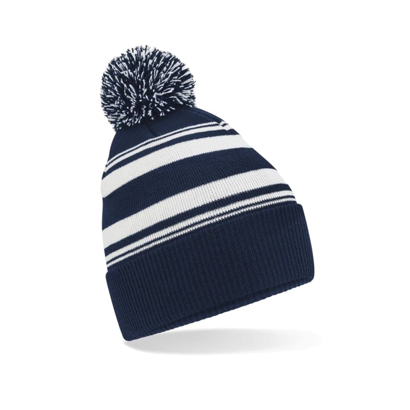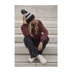 Contient 50% de polyester recyclé. Doublé. Pompon bicolore. Avec revers.