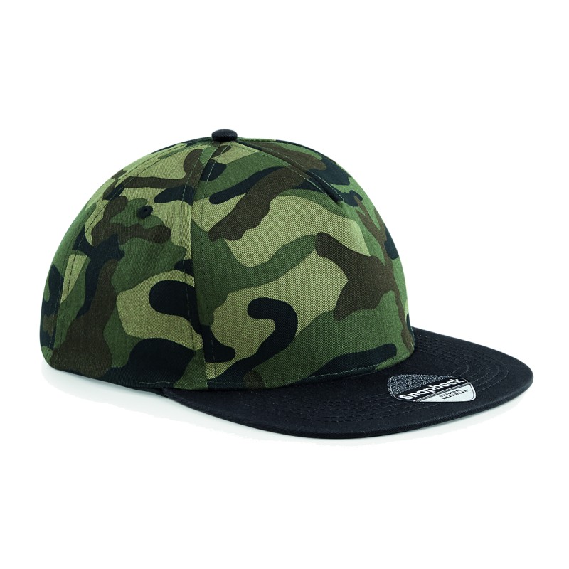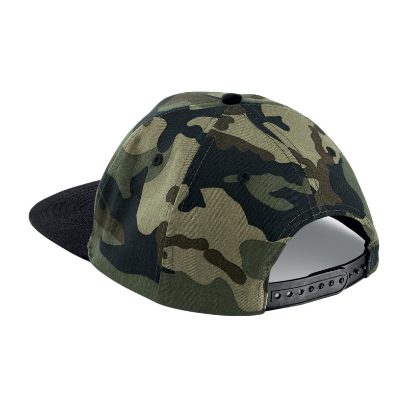 100 % coton twill | 5 panneaux design | Trous d'aération brodés | Visière plat | Fermeture en matière plastique à taille ajustable | Détails de camouflage | Etiquette TearAway pour une simple personnalisation