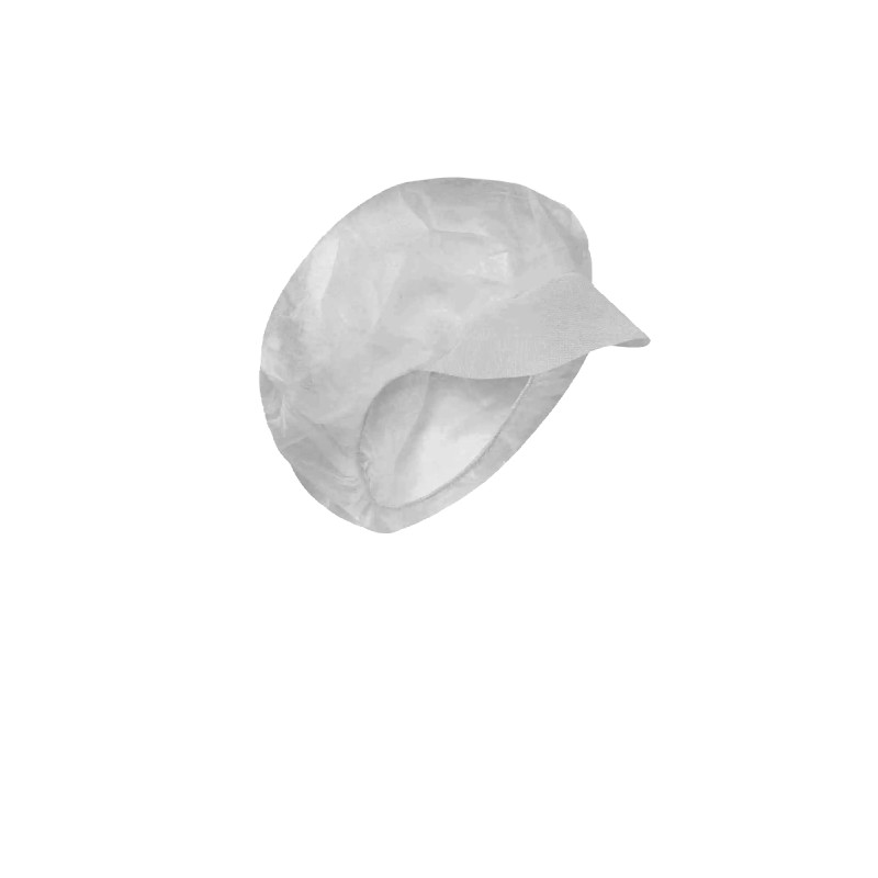 Casquette a usage unique en « tissu non tisse », dotee d'une visiere et d'un filet a cheveux. Carton de 1 000 pieces emballees dans 10 sachets de 100 unites.