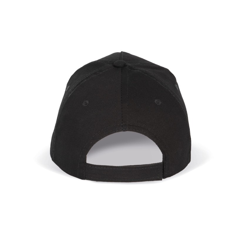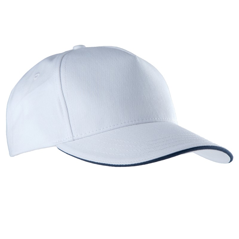 100% coton sergé. Casquette 5 panneaux avec sandwich contrasté, bande de transpiration en coton. Fermeture réglable avec bande auto-agrippante.