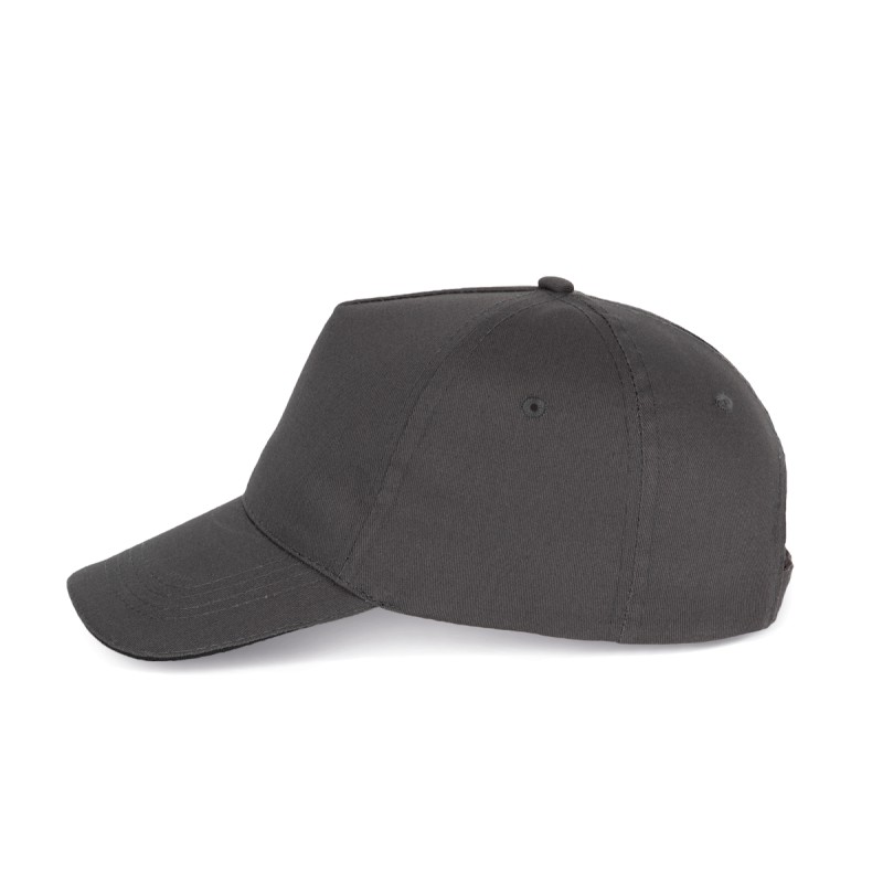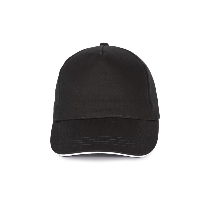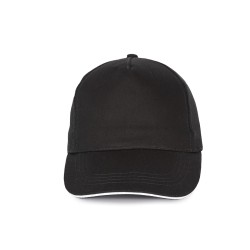 100% coton sergé. Casquette 5 panneaux avec sandwich contrasté, bande de transpiration en coton. Fermeture réglable avec bande auto-agrippante.