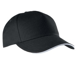 100% coton sergé. Casquette 5 panneaux avec sandwich contrasté, bande de transpiration en coton. Fermeture réglable avec bande auto-agrippante.