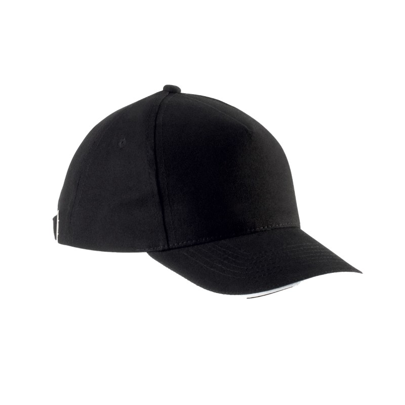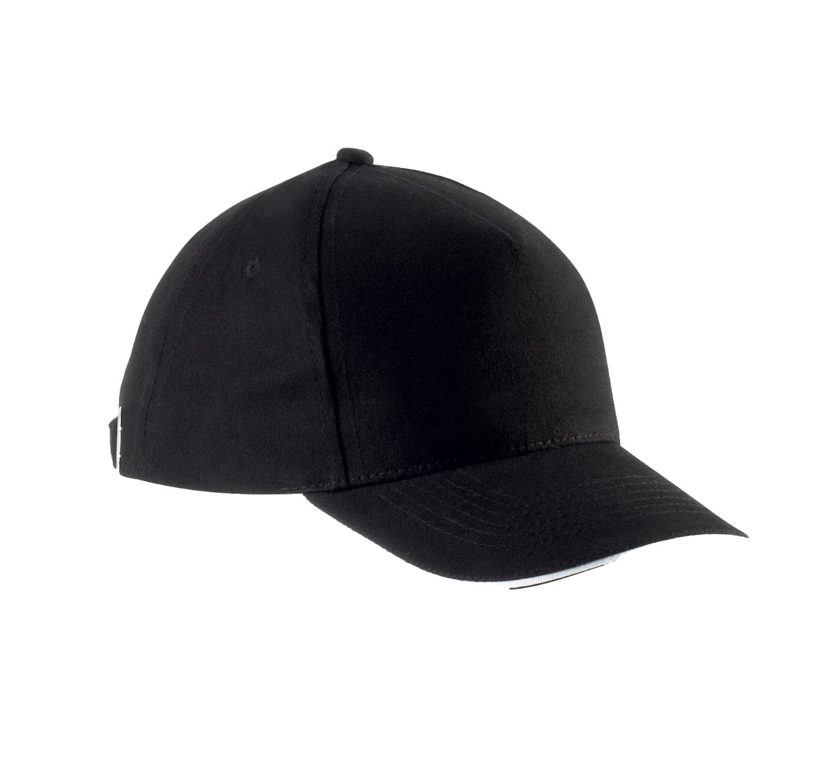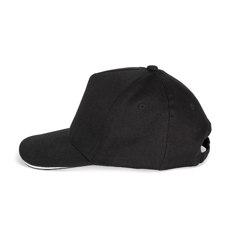 100% coton sergé brossé. 5 panneaux. Sandwich contrasté. Fermeture arrière réglable par boucle métallique. Tour de tête : 53 cm.