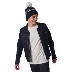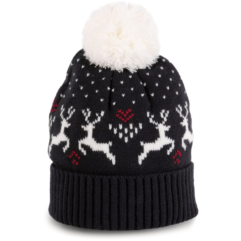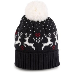 100% acrylique, bord 100% polyester. Bonnet aux motifs fantaisie rennes.