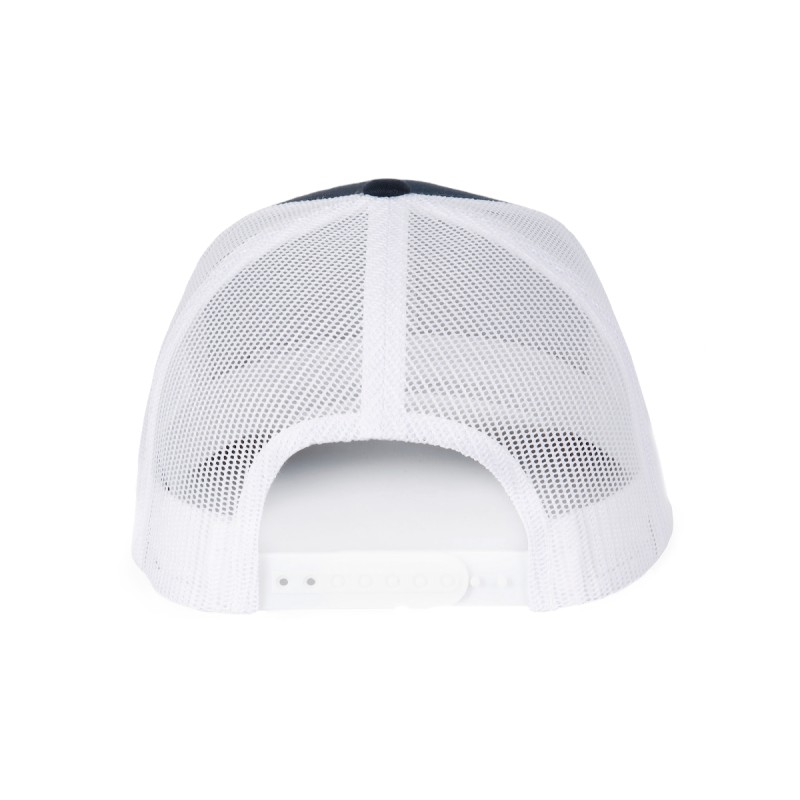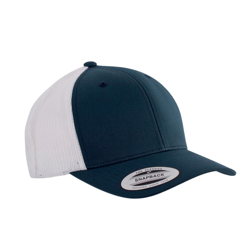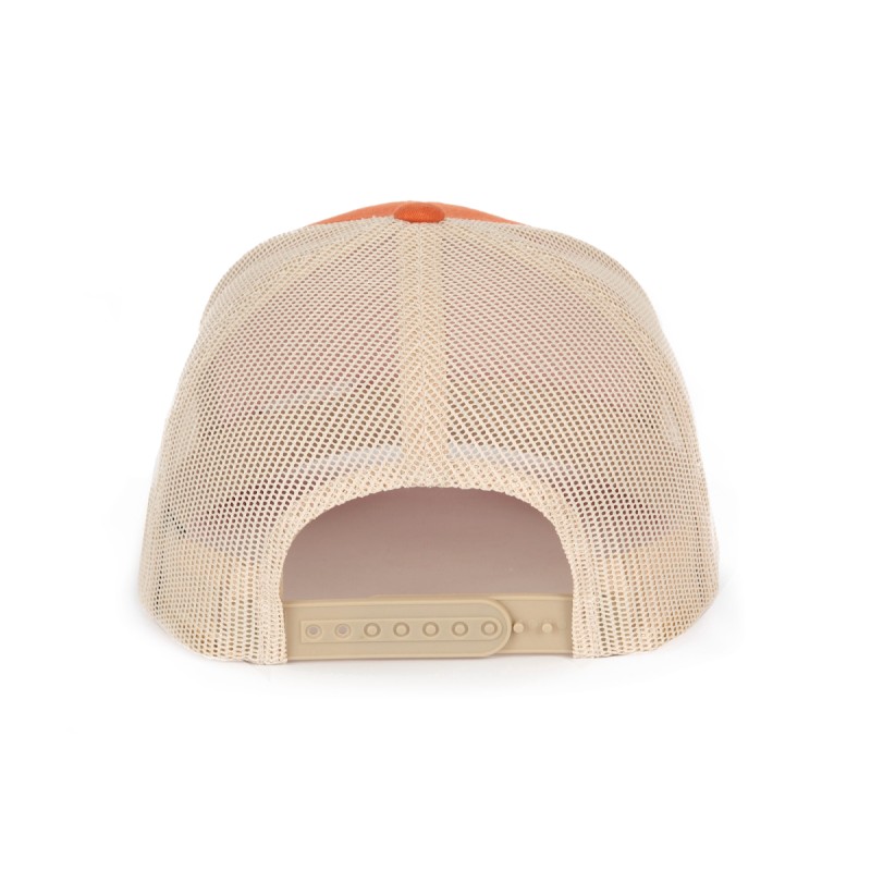 60% coton / 40% polyester. 6 panneaux. Modèle Trucker rétro de haute qualité avec visière mi-profil et panneaux avants rigidifiés de même couleur. Languette de règlage en plastique.