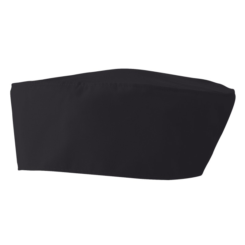 Taille unique. Calot de Cuisinier à dessus plat. Dos élastiqué, fini infroissable. Lavage industriel 85°C, lavage domestique 60°C.