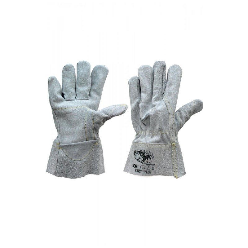 Gants en croûte de cuir de bovin, double paume, renfort de protection veines poignet, tige de renfort au pouce, pouce inséré, élastique intérieur, manchette en peau de 7 cm, coutures en fil kevlar - Caractéristiques: robuste, très résistant - Atouts: préhension, protection - Utilisations: manipulations lourdes, adaptés au contact avec des matériaux chauds, ébavurés
