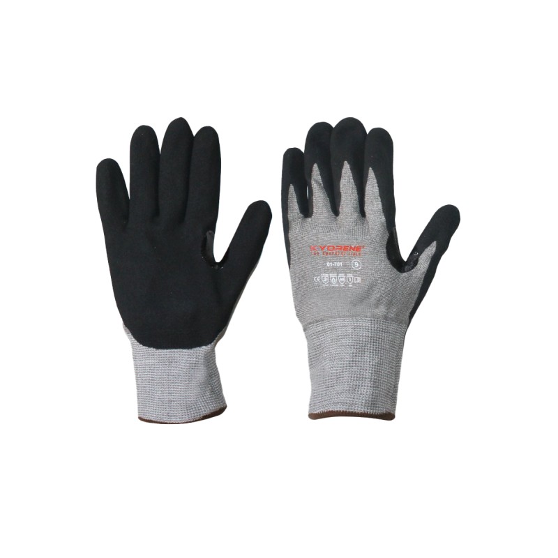 Gant anti-coupures KYORENE doublure 13G, dos aéré, poignet en tricot, enduit Nitrile - Caractéristiques : robuste - Atouts : confort, préhension, sensibilité, précision, résistant à la coupe - Utilisations : manipulation et assemblage d'objets coupants, secs ou légèrement huileux.