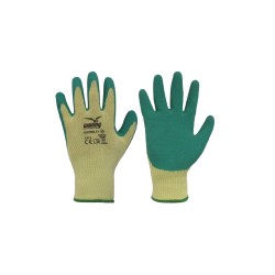 Gants enduits latex, dos aéré, poignet en tricot, paume anti-glisse, coton/polyester 10G enduit - Caractéristiques: souple, robuste, résistant - Atouts: résistant à la coupe, résistant aux liquides, confort, préhension, précision - Utilisations: la finition crêpée garantit une préhension excellente, même humide, sur des surfaces glissantes et protège des matériaux coupants. Unité minimum commercialisable : 1 douzaine (12 paires). Le bord sera de couleur différente selon la taille.
