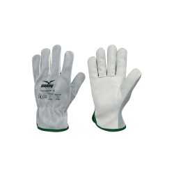 Gant avec paume en cuir fleur de bovin et dos en croûte bovin, bordé. Elastiques serre-poignet. - Caractéristiques : souple, robuste, résistant - Atouts : confort, dextérité - Utilisations : manipulations génériques en milieu sec. Unité minimum commercialisable : 1 douzaine (12 paires). La couleur du bord change en fonction de la taille.
