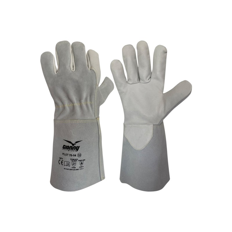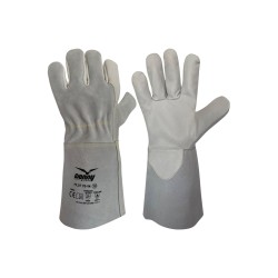 Gant pour soudeurs avec paume et index en fleur de bovin, dos en cuir croûte de bovin et manchette en cuir croûte de buffle de 14 cm. Protection veine en fleur de bovin et élastique serre-poignet. Coutures en fil para-aramide. Caractéristiques : souple, robuste, résistant - Atouts : confort, dextérité - Utilisations : adapté à la manipulation d'objets lourds, anguleux, rugueux, abrasifs et chauds, pour le nettoyage d'installations, la menuiserie, la charpenterie métallique, les opérations de soudage. Unité minimum commercialisable : 1 douzaine (12 paires).