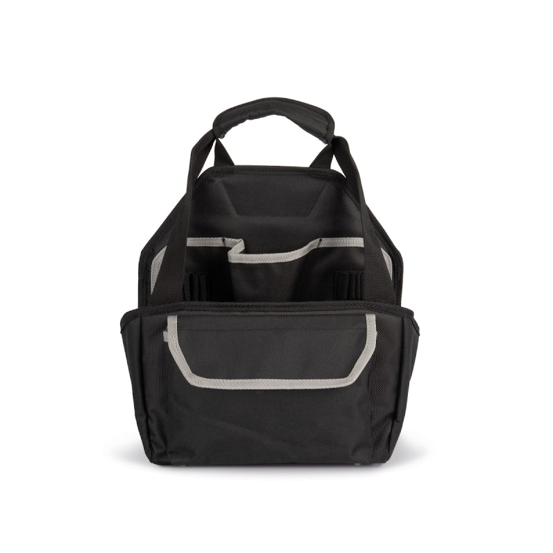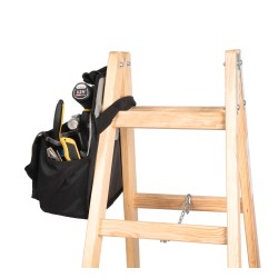 100% polyester. Ce sac peut être utilisé pour transporter des outils pour toute occasion, mais sa forme avec son dos plat et ses poignées spéciales en font la solution idéale pour les travaux sur escabeau. Le sac s’adapte aux échelles doubles classiques et permet à l’opérateur de toujours avoir ses outils à portée de main. Le large compartiment central permet de ranger des outils volumineux comme la perceuse, et les panneaux compartimentés de ranger clés et tournevis. Poche avant porte-objets facilement personnalisable.