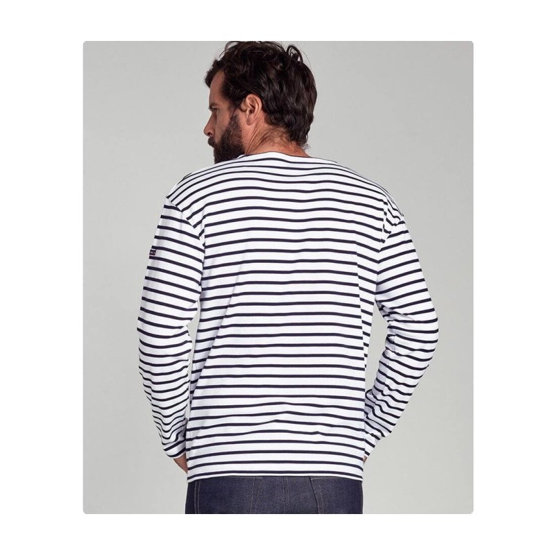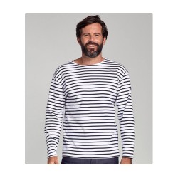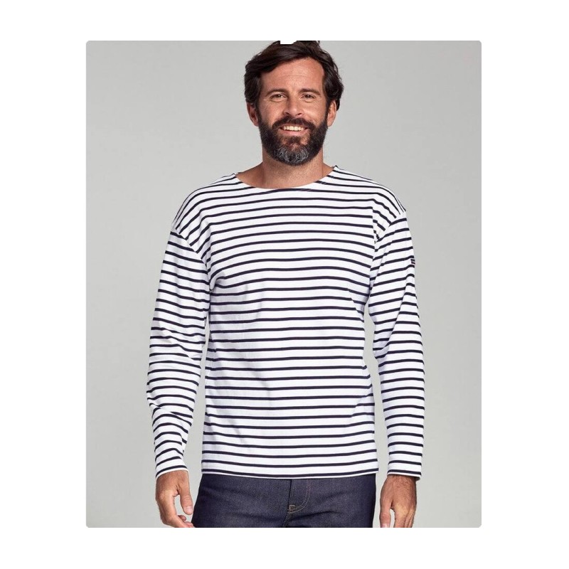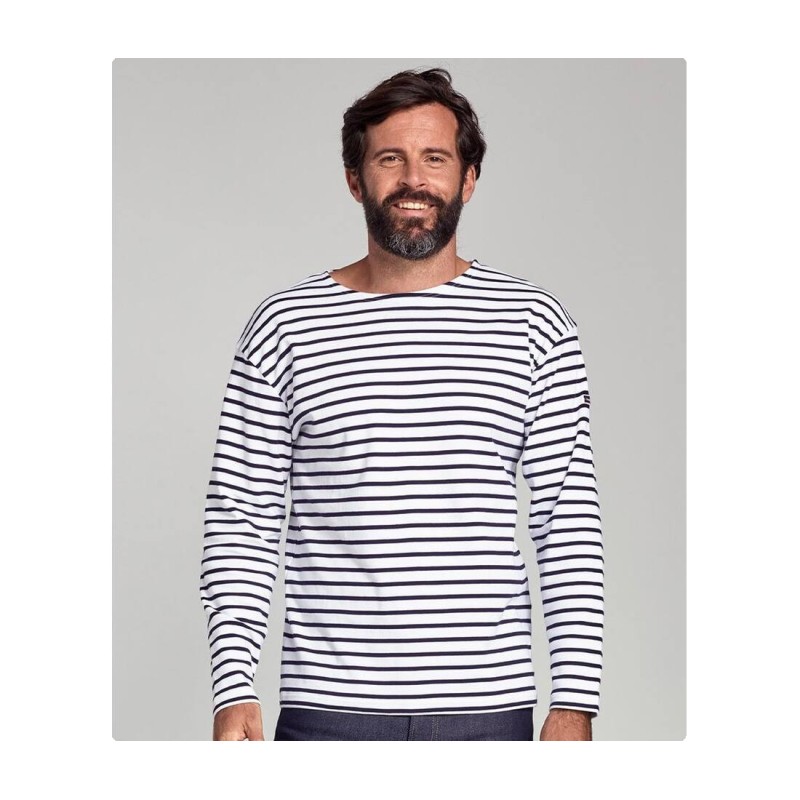 Marinière manches longues. Col bateau. Étiquette Armor Lux sur la manche gauche.