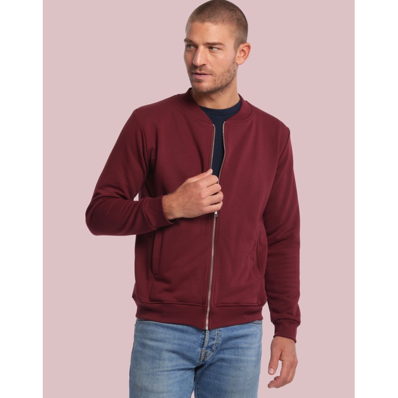 Blouson Made in France façon Teddy. 80% coton biologique certifié OCS, 20% polyester recyclé. 2 poches mains passepoilées. Matière Terry 350g/m² lavée, non grattée pour éviter le boulochage + traitement silicone pour améliorer la longévité du vêtement. Col en demi lune. Double piqure en bas de veste. Bande de propreté au col. Zip central YKK.  Disponible sur stock et livré sous 24/48h sans personnalisation, coloris disponibles : Blanc, Marine, Noir, Bordeaux, Vert Bouteille, Vert Bouteille, Gris Chiné Clair, Gris Chiné Foncé dans les tailles XS, S, M, L, XL, 2XL, 3XL
