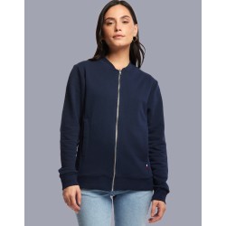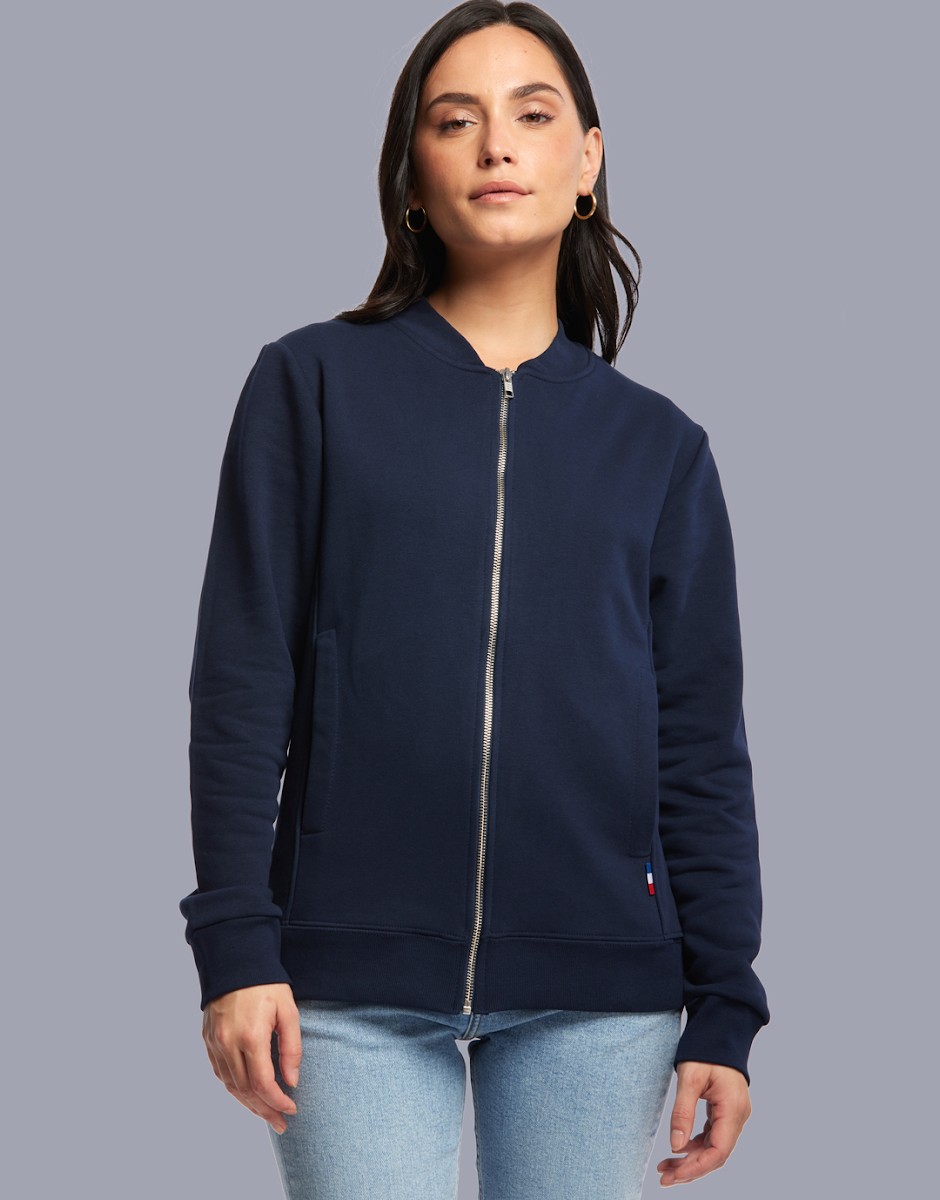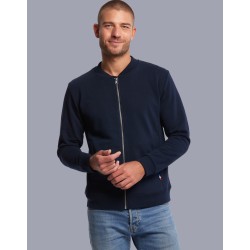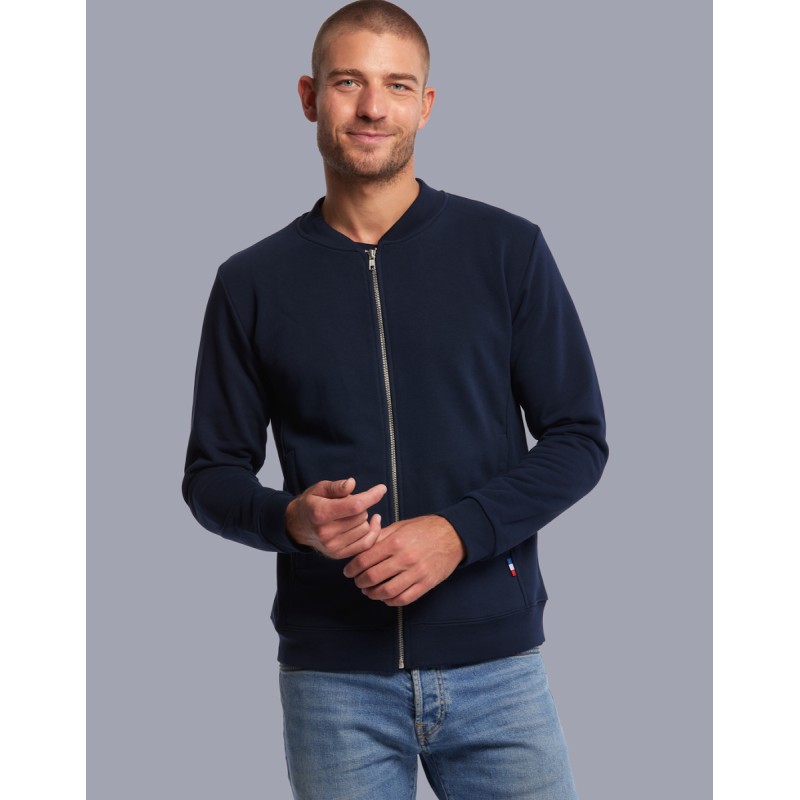 Blouson Made in France façon Teddy. 80% coton biologique certifié OCS, 20% polyester recyclé. 2 poches mains passepoilées. Matière Terry 350g/m² lavée, non grattée pour éviter le boulochage + traitement silicone pour améliorer la longévité du vêtement. Col en demi lune. Double piqure en bas de veste. Bande de propreté au col. Zip central YKK. Disponible sur stock et livré sous 24/48h sans personnalisation, coloris disponibles : Blanc, Marine, Noir, Bordeaux, Vert Bouteille, Vert Bouteille, Gris Chiné Clair, Gris Chiné Foncé dans les tailles XS, S, M, L, XL, 2XL, 3XL