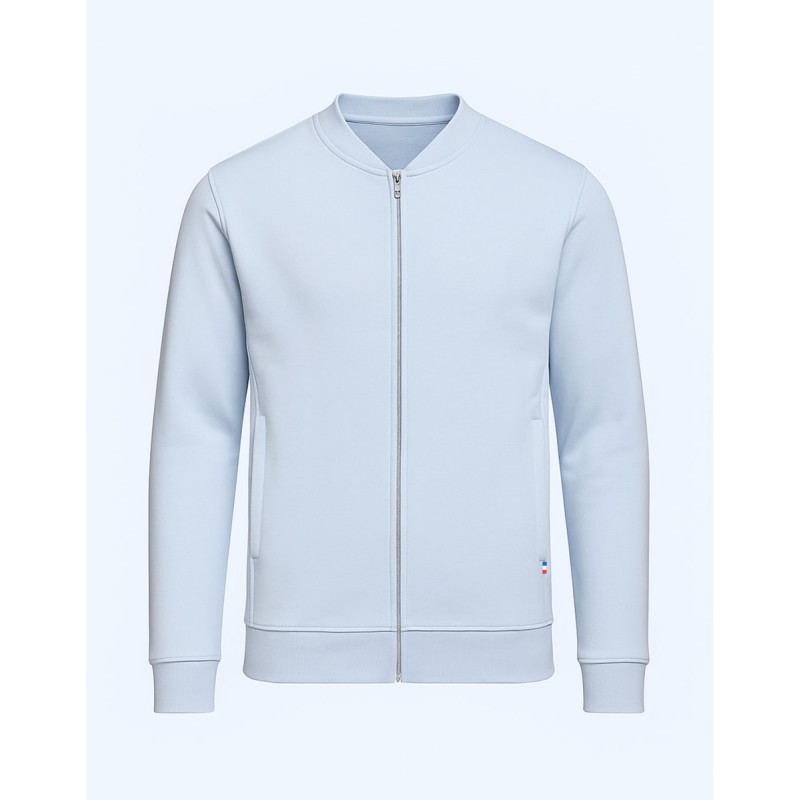 Blouson Made in France façon Teddy. 80% coton biologique certifié OCS, 20% polyester recyclé. 2 poches mains passepoilées. Matière Terry 350g/m² lavée, non grattée pour éviter le boulochage + traitement silicone pour améliorer la longévité du vêtement. Col en demi lune. Double piqure en bas de veste. Bande de propreté au col. Zip central YKK. Disponible sur stock et livré sous 24/48h sans personnalisation, coloris disponibles : Blanc, Marine, Noir, Bordeaux, Vert Bouteille, Vert Bouteille, Gris Chiné Clair, Gris Chiné Foncé dans les tailles XS, S, M, L, XL, 2XL, 3XL