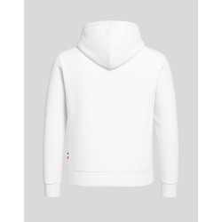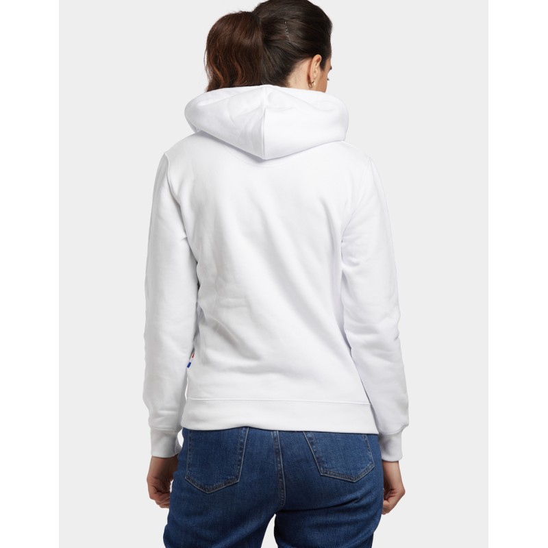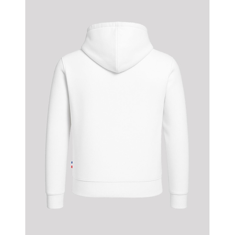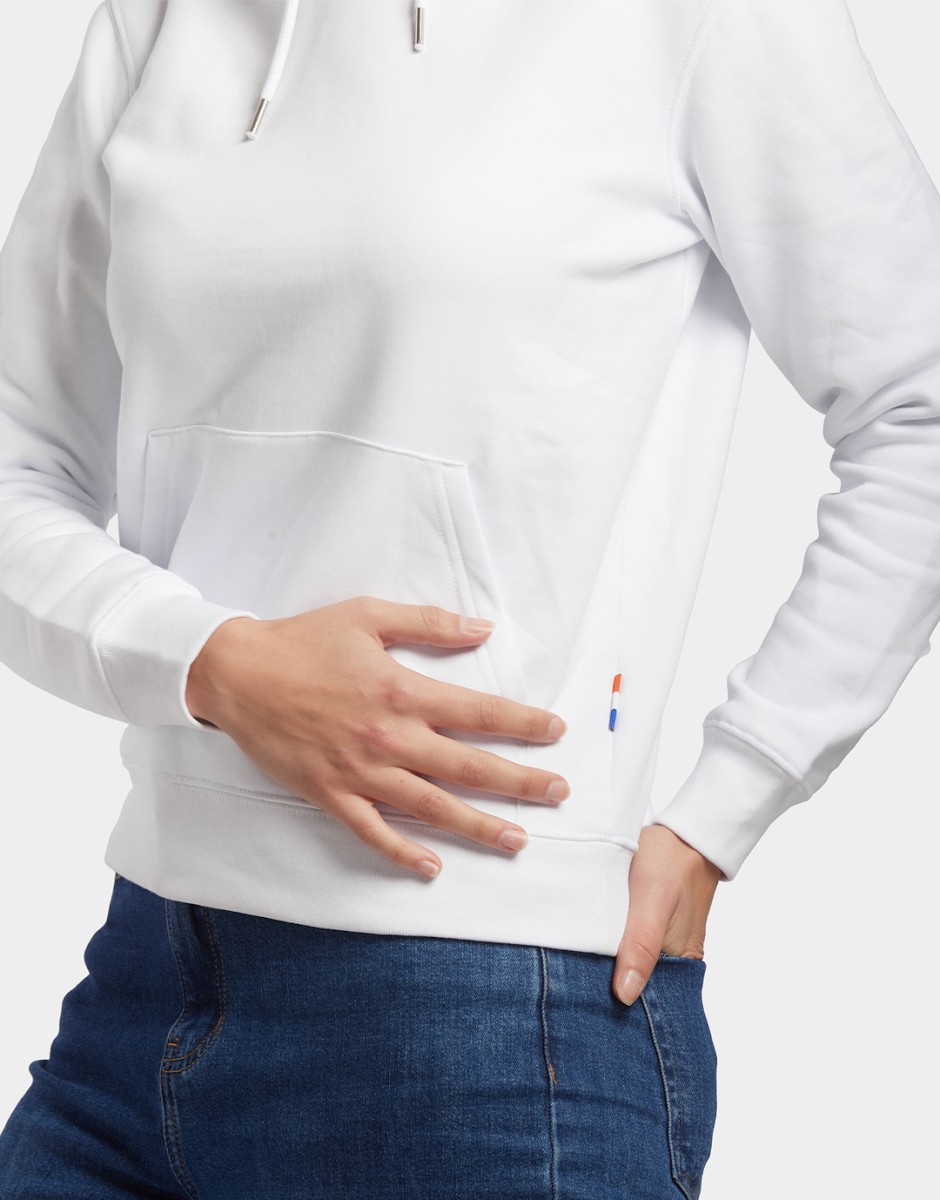 Sweat-Shirt Capuche Hoodie unisexe Made in France 80% coton biologique certifié OCS 20% polyester recyclé. Matière Terry 350g/m² lavée, non grattée pour éviter le boulochage + traitement silicone pour améliorer la longévité du vêtement. Capuche doublée dans la matière. Cordon ton sur ton avec embout métal. Col en demi lune dans la matière extérieure. Poche ventrale kangourou. Bande de propreté au col. Double piqure en bas de corps et de manches. Toucher soyeux Disponible sur stock et livré sous 24/48h sans personnalisation, coloris disponibles : Blanc dans les tailles 2XS - XS - S - M - L - XL - 2XL