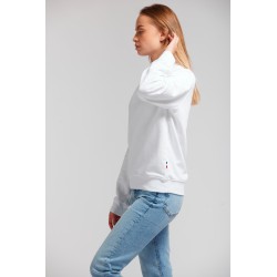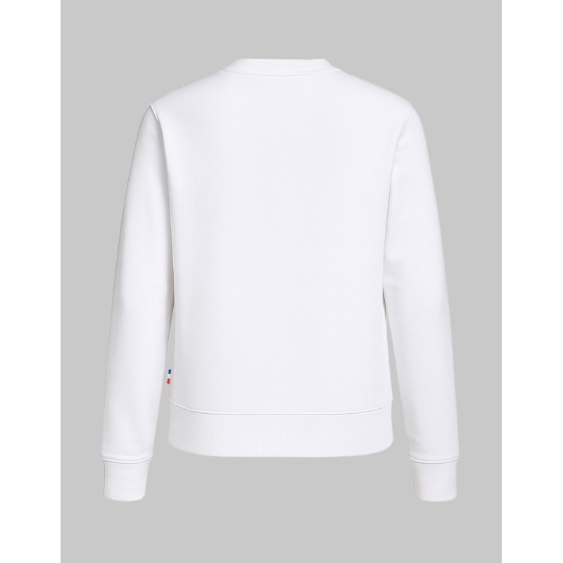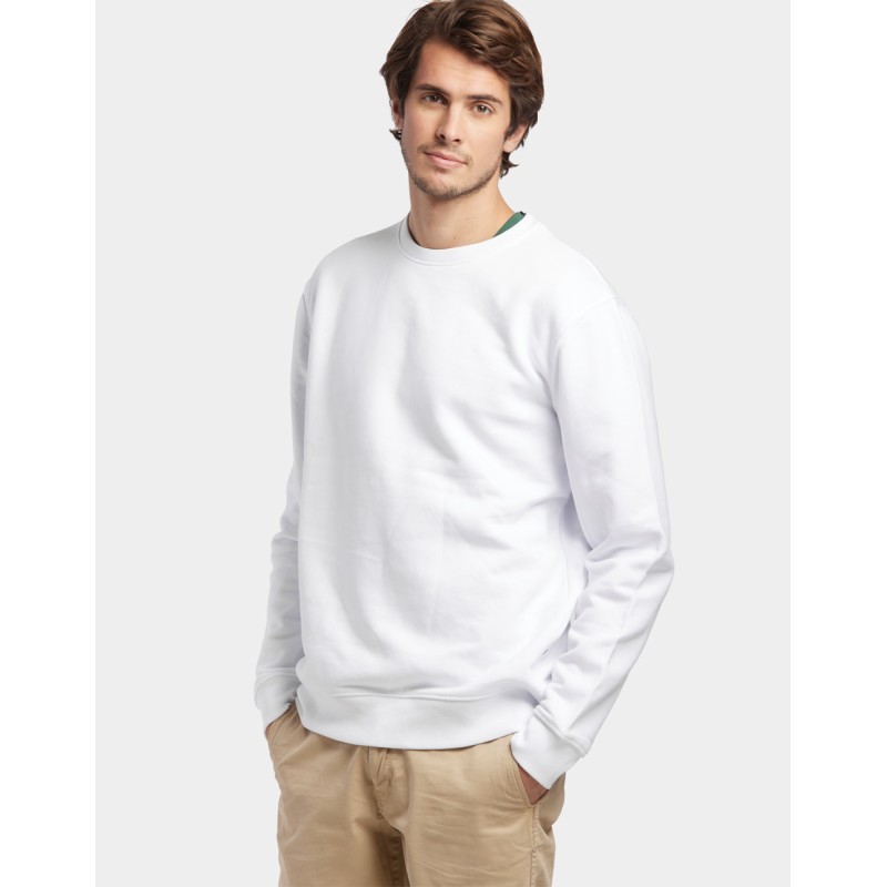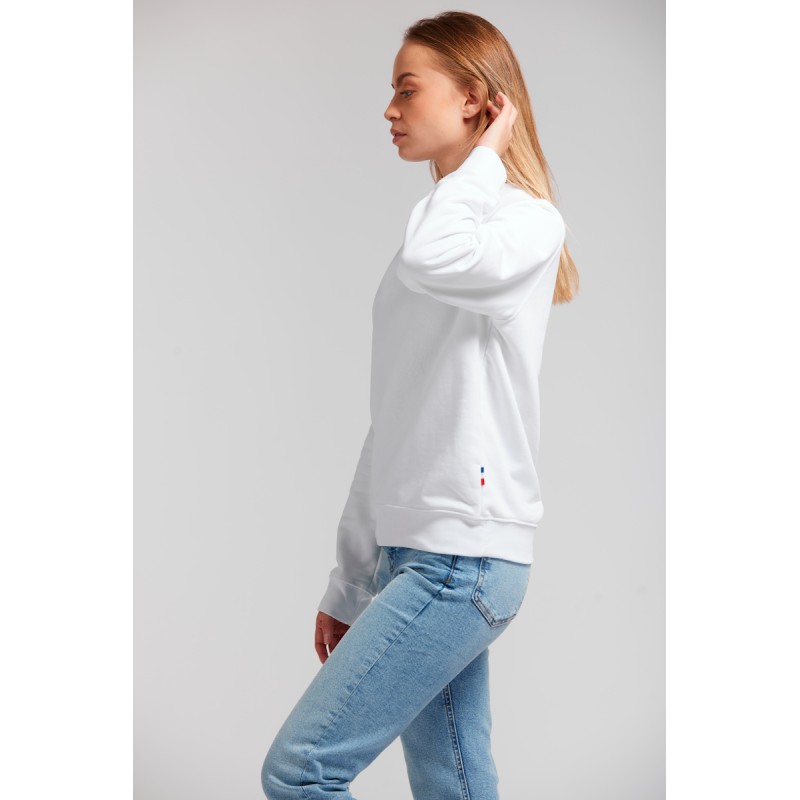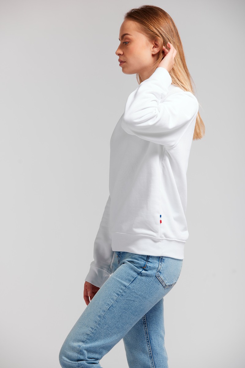 Sweatshirt shirt unisexe Made in France 80% coton biologique certifié OCS 20% polyester recyclé. Matière Terry 350g/m² lavée, non grattée pour éviter le boulochage + traitement silicone pour améliorer la longévité du vêtement. Col rond standard en bord-côte 1x1 100% coton biologique. Col en demi lune dans la matière extérieure. Bande de propreté au col. Double piqure en bas de corps et de manches. Toucher soyeux Disponible sur stock et livré sous 24/48h sans personnalisation, coloris disponibles : Blanc dans les tailles 2XS,XS,S,M,L,XL,2XL