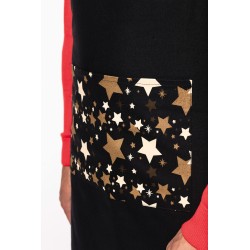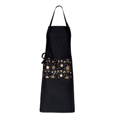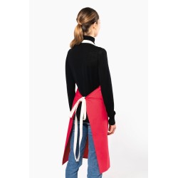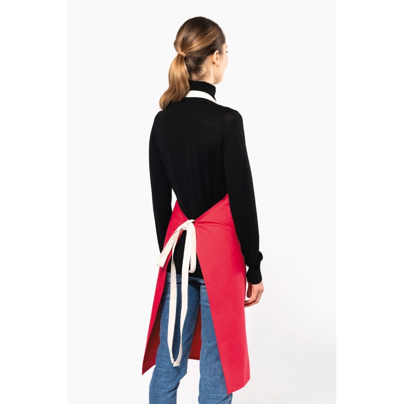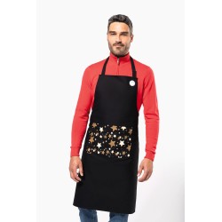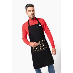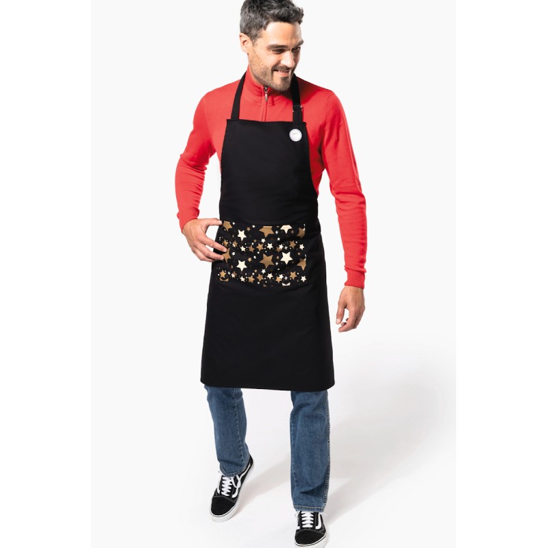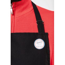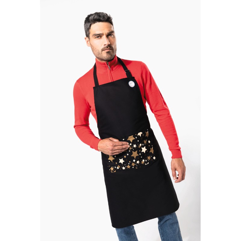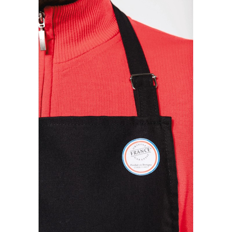 100% coton. Lavage domestique 60°C. Boucle de réglage en métal au niveau du cou pour ajuster la longueur du tablier. Grande poche avec motifs étoiles sérigraphiés à l'avant. Lanières réglage col et taille contrastées en natural sur coloris rouge et ton sur ton sur coloris noir. Label "Origine France garantie. Produit en Bretagne" devant. Label OFG (Origine France Garantie). Dimensions : H 93 cm x L 78 cm. Poche : H 21 cm x L 31 cm.