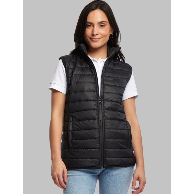 Doudoune sans manches Femme Made in France, fabriquée dans l'Oise. Coupe cintrée. Extérieur en polyester dont 30% de polyester recyclé, garnissage vegan en polyester. Matelassage fin. Coupe droite. Poches mains passepoilées. 2 poches intérieures plaquées. Zip central YKK imperméable. Disponible sur stock et livré sous 24/48h sans personnalisation, coloris disponibles : Noir, Marine, Gris dans les tailles XS, S, M, L, XL, 2XL