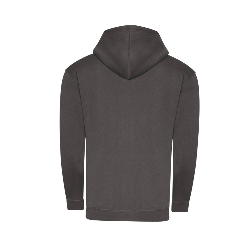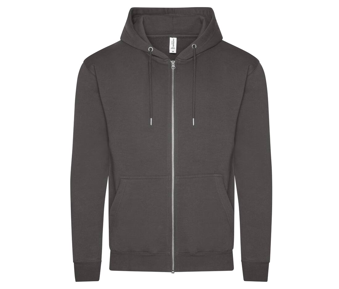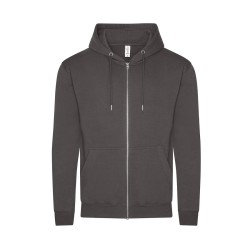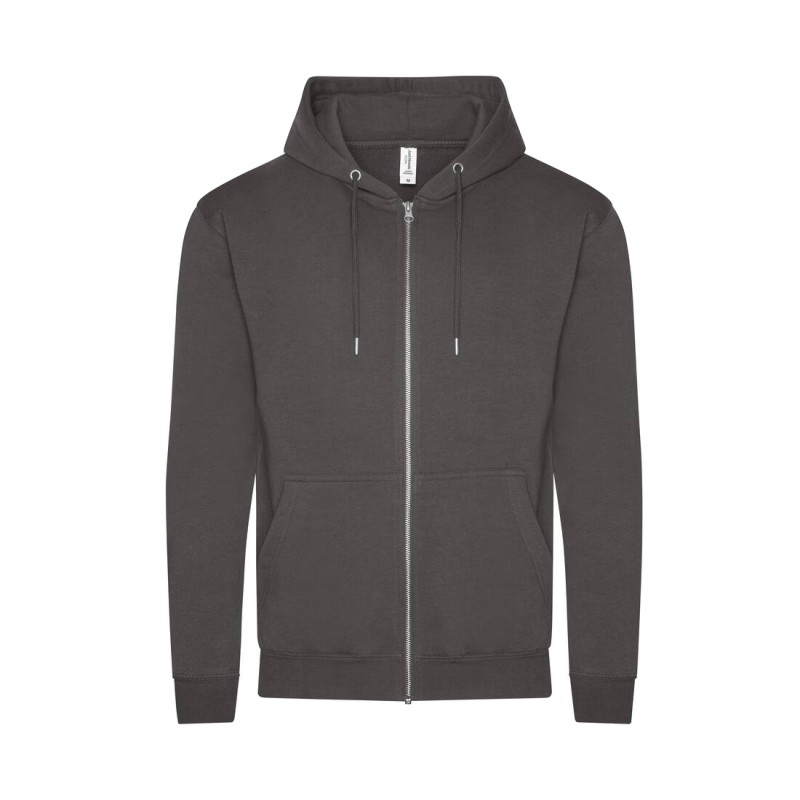 Sweat-shirt zippé à capuche. Fermeture Éclair YKK métallique couverte. Capuche doublée avec cordons de serrage ton sur ton.