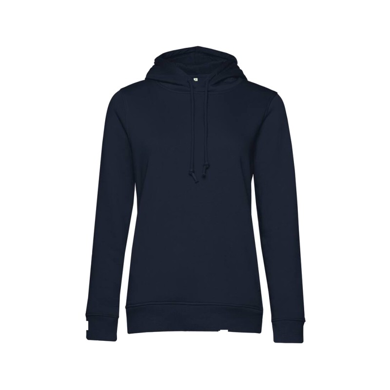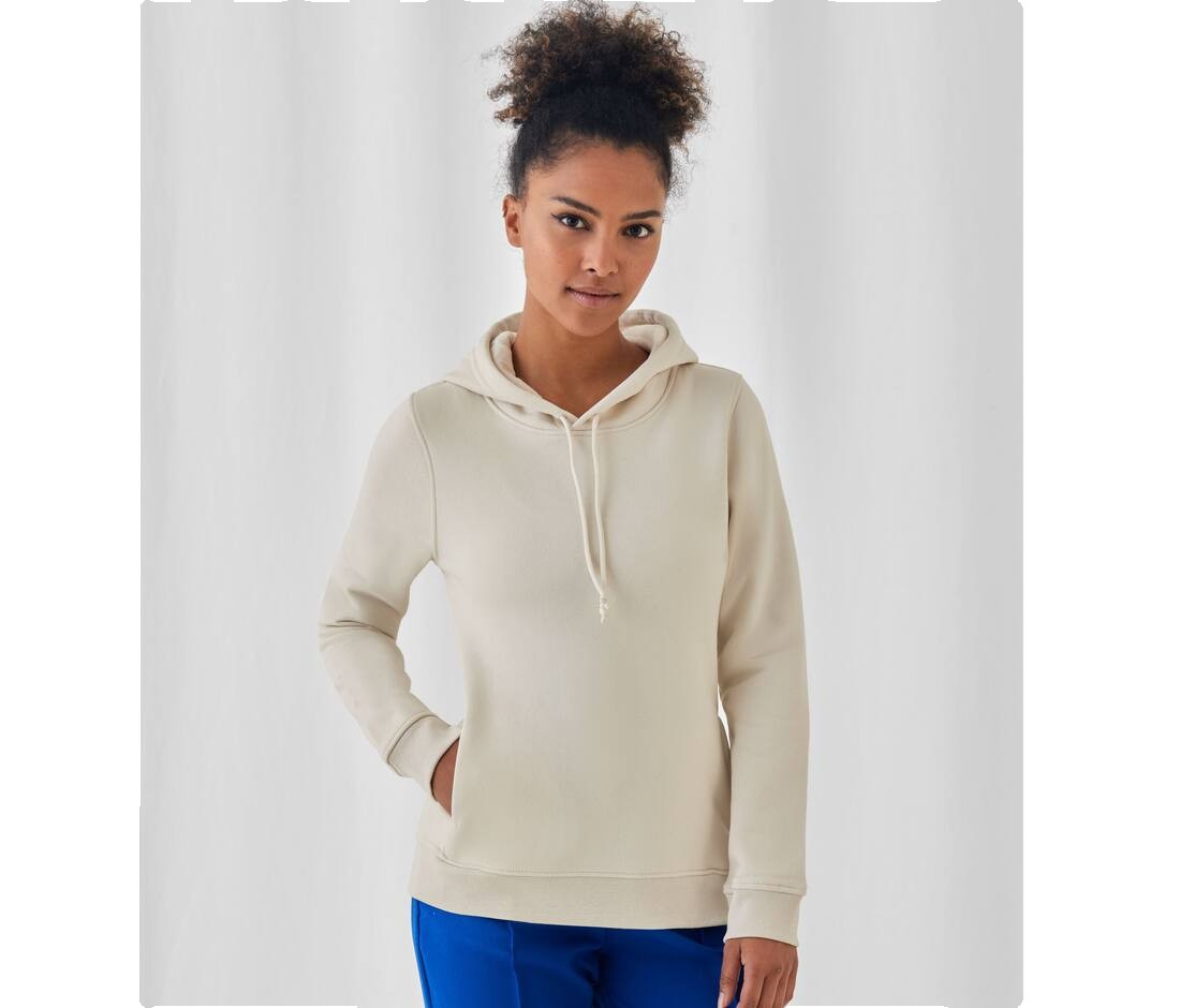 Sweat-shirt femme à capuche, organique ou organique en conversion et au design tendance. Capuche doublée avec cordon. Bande de propreté en chevron.