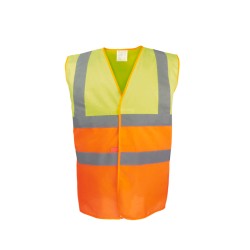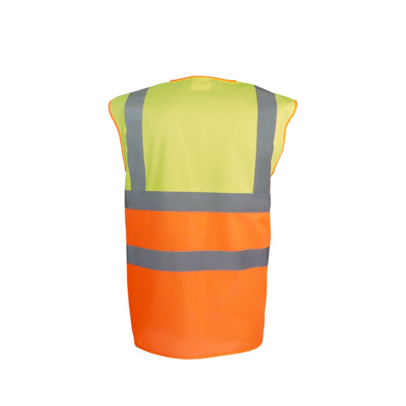 100% polyester. Gilet deux tons contrastés, en tissu recyclé 100 % polyester, avec fermeture auto-agrippante ; Deux bandes réfléchissantes de 5 cm de large autour du corps et une sur chaque épaule ; Jaune/Orange Hi-Vis conforme à la norme EN ISO20471:2013 Classe 2 ; Toutes les autres couleurs sont conformes à la norme EN ISO20471:2013 Classe 1.
