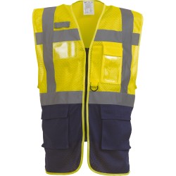 100% polyester. 100% polyester recyclé. Fabriqué à partir de bouteilles en plastique PET. Maille filet légère et respirante. Bande réfléchissante (largeur 5 cm) sur le corps et l'épaule. Fermeture avant zippée. Composé de multiples poches et d'une boucle porte radio ultra-pratiques : poche pour portable / talkie-walkie côté cœur, 2 poches avec rabat sur le bas du vêtement avec double accès haut et côté, poches stylo et porte-clés, poche poitrine transparente pour pièce d’identité sur le côté droit. Conforme à la norme EN ISO20471:2013 de catégorie 1 & 2, et la norme EN 1150:1999 PASS.