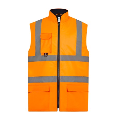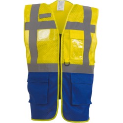 100% polyester. 100% polyester recyclé. Fabriqué à partir de bouteilles en plastique PET. Maille filet légère et respirante. Bande réfléchissante (largeur 5 cm) sur le corps et l'épaule. Fermeture avant zippée. Composé de multiples poches et d'une boucle porte radio ultra-pratiques : poche pour portable / talkie-walkie côté cœur, 2 poches avec rabat sur le bas du vêtement avec double accès haut et côté, poches stylo et porte-clés, poche poitrine transparente pour pièce d’identité sur le côté droit. Conforme à la norme EN ISO20471:2013 de catégorie 1 & 2, et la norme EN 1150:1999 PASS.