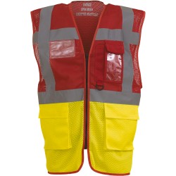 100% polyester. 100% polyester recyclé. Fabriqué à partir de bouteilles en plastique PET. Maille filet légère et respirante. Bande réfléchissante (largeur 5 cm) sur le corps et l'épaule. Fermeture avant zippée. Composé de multiples poches et d'une boucle porte radio ultra-pratiques : poche pour portable / talkie-walkie côté cœur, 2 poches avec rabat sur le bas du vêtement avec double accès haut et côté, poches stylo et porte-clés, poche poitrine transparente pour pièce d’identité sur le côté droit. Conforme à la norme EN ISO20471:2013 de catégorie 1 & 2, et la norme EN 1150:1999 PASS.